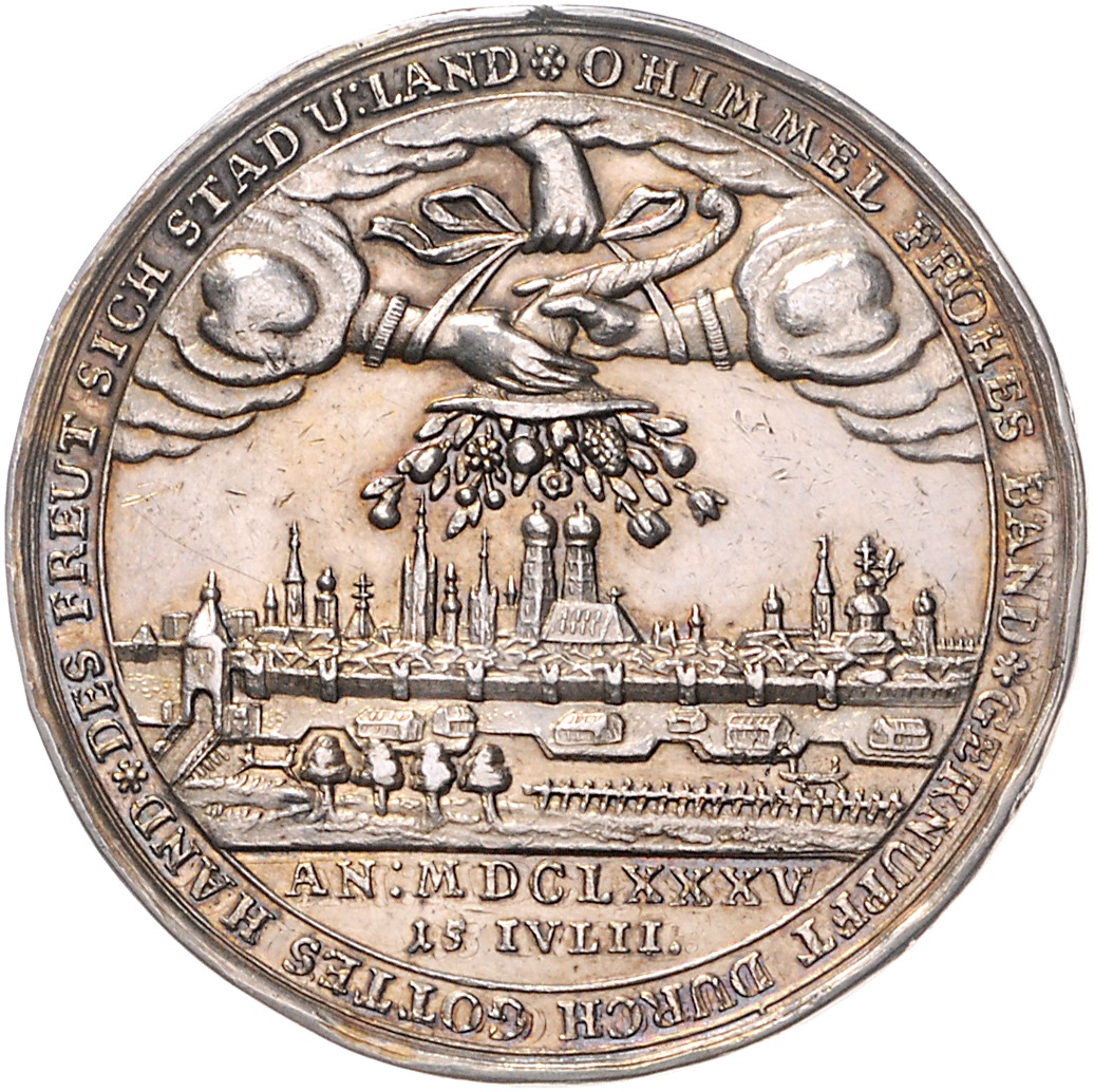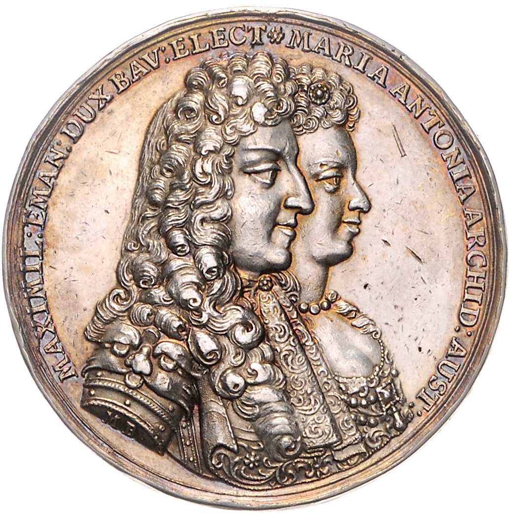 Maximilian II. Emanuel 1679-1726. Silbermedaille 1685 (v. M. Brunner) auf seine Vermählung mit Maria Antonia, mit Randschrift. Wittelsbach 1466, Slg. Montenuovo 944. kl. Kr. und leichter Sf. bei 12 Uhr, schöne Patina 44,7 mm, 34,04 g. vz