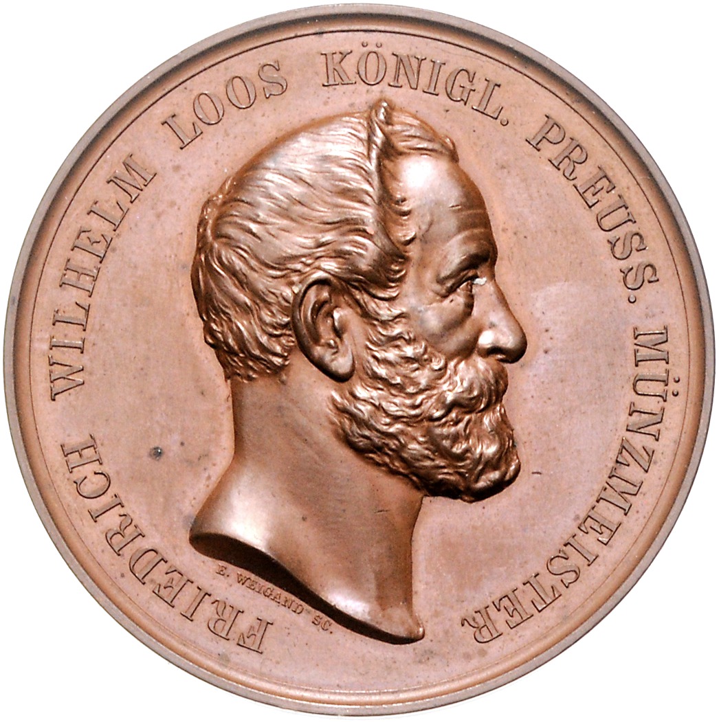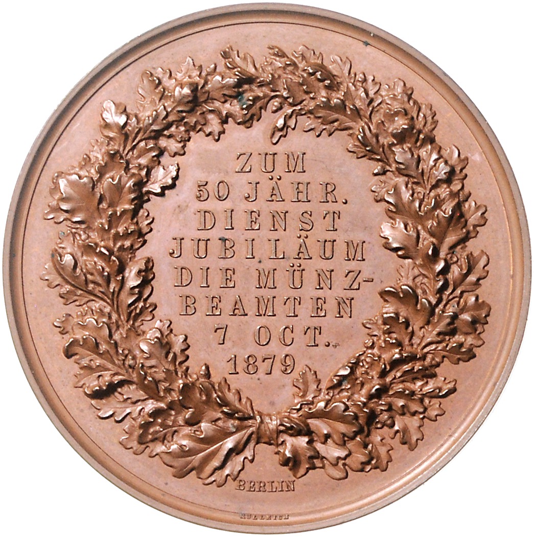 Wilhelm I. 1861-1888. Bronzemedaille 1879 owidctlpar (v. Weigand/Kullrich) auf das 50-jährige Dienstjubiläum von Friedrich Wilhelm Loos, königl. preuss. Münzmeister, gewidmet von den Münzbeamten in Berlin. Slg. Marienburg 7697, Sommer W34/K89. 45,0 mm, 41,38 g. vz-st