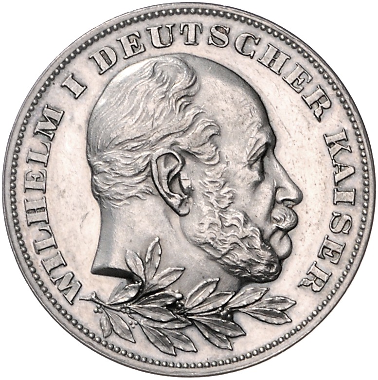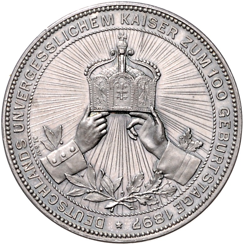 Wilhelm I. 1861-1888. Silbermedaille 1897 (v. M.&W.) auf seinen 100. Geburtstag, ohne Randpunzierung. Slg. Marienburg 7098. Kaiser 385 33,3 mm, 17,08 g. vz-st