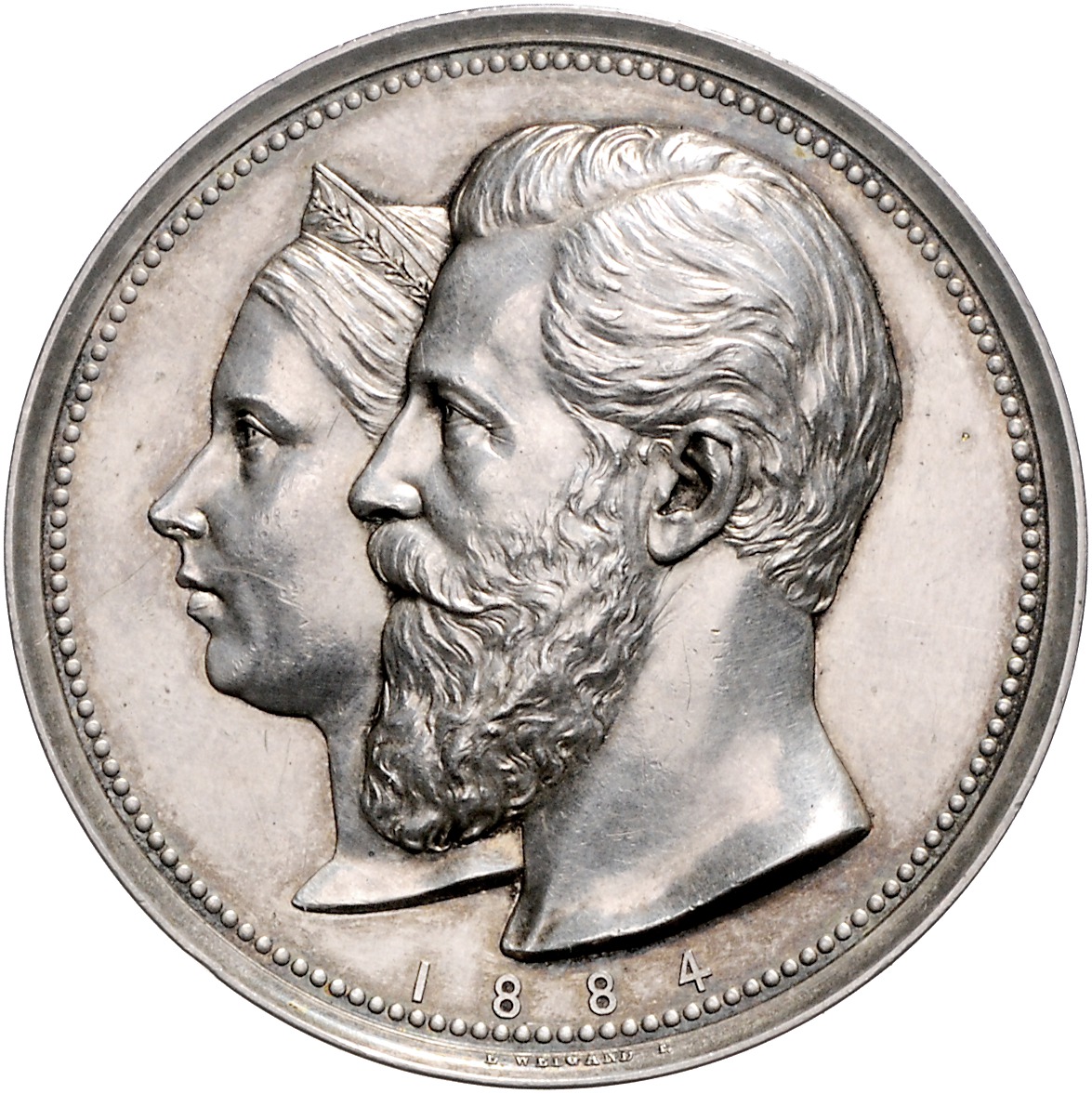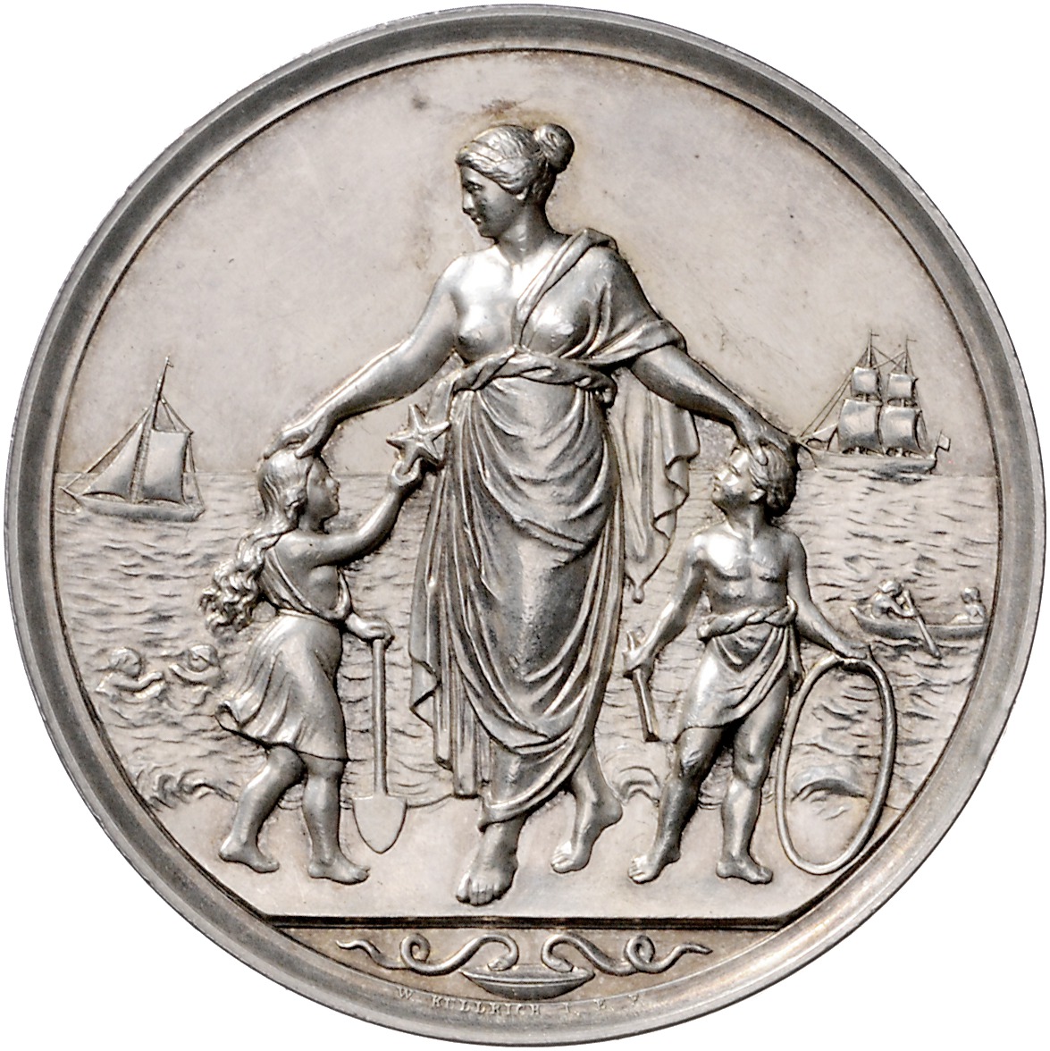 Friedrich III. 1888. Silbermedaille 1884 (v. Weigand/Kullrich) auf die Einrichtung von Ferienkolonien an der Ostsee, mit den Köpfen des Kronprinzenpaares. Sommer W43/K112, Slg. Brettauer 3996. 50,6 mm, 58,68 g. vz