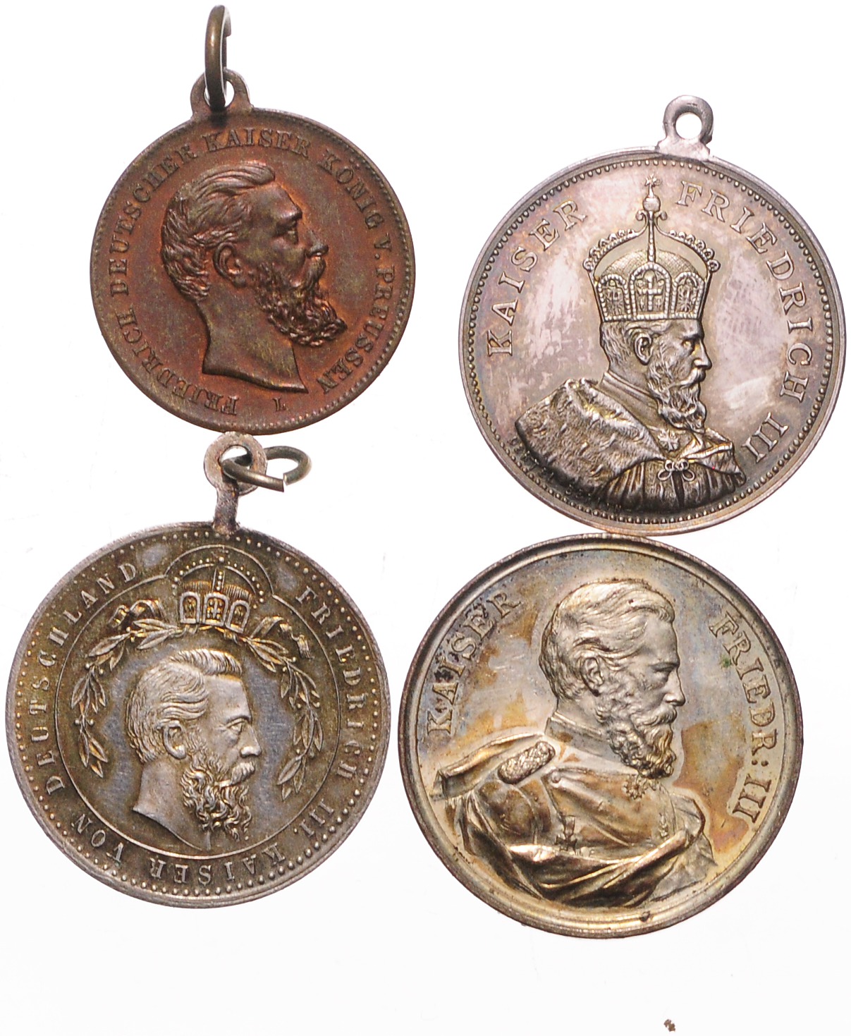 Friedrich III. 1888. Lot von 4 kleinen Medaillen auf seinen Tod: Silbermedaille (v. Oertel) `Heimgegangen am 15. Juni 1888 dem 99. Tage seiner Regierung | Bronzemedaille (v. Lauer) `Lerne leiden ohne zu klagen` | 2x versilberte Medaille (unsign.) `Ewig unvergesslich deutschen Herzen` und `Lerne zu leiden ohne zu klagen`. 3x mit Öse. vz und besser
