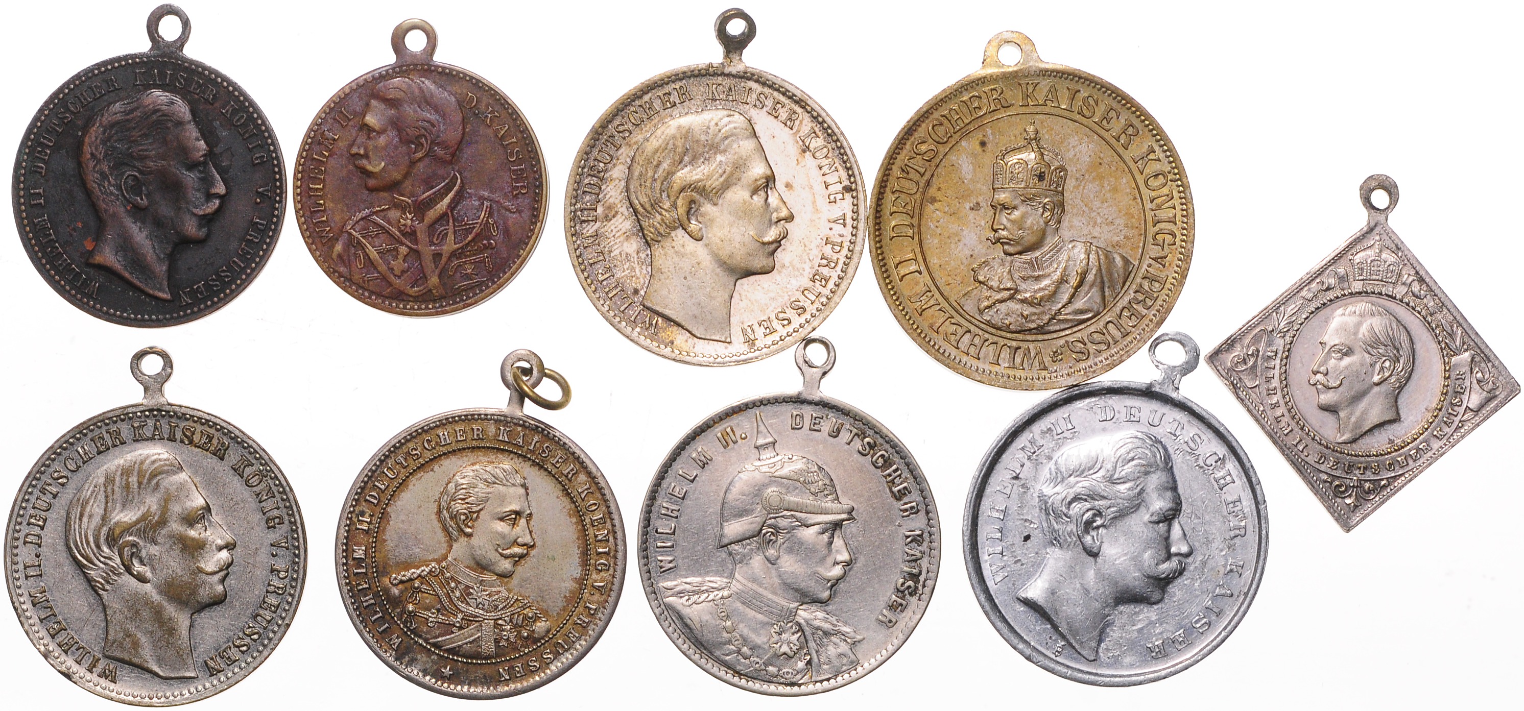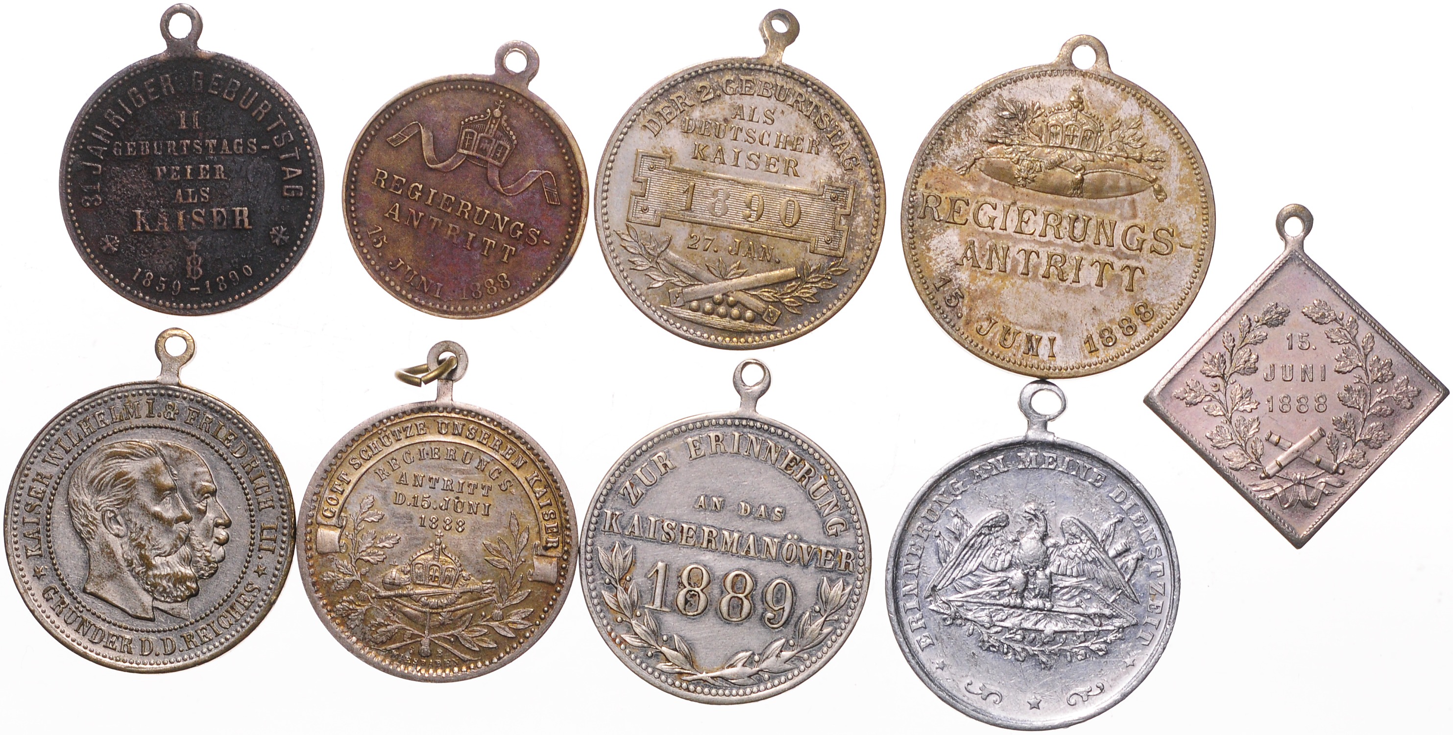 - Beschreibung: Wilhelm II. 1888-1918. Lot von 9 kleinen Medaillen Versilberte Medaille 1889 (unsign.) Zur Erinnerung an das Kaisermanöver (28,3mm 8,08g) | Versilberte Medaille 1888 (unsign.) auf das Dreikaiserjahr (28,4mm 7,96g) | Silberklippe 1888 (unsign.) auf seinen Regierungsantritt (21,2mm 5,41g) | Versilberte Bronzemedaille 1888 (v. G.B Wiesbaden) gleicher Anlass (27,2mm 7,64g) | Versilberte Bronzemedaille 1888 (v. Lauer) gleicher Anlass (30,3mm 14,81g) | Bronzemedaille 1888 (unsign.) gleicher Anlass (23,9mm 5,11g) | Versilberte Bronzemedaille 1890 (unsign.) auf seinen 2. Geburtstag als Kaiser (28,2mm 7,75g) | Bronzemedaille 1890 (unsign.) gleicher Anlass (25,6mm 5,87g) | Aluminiummedaille o.J. Erinnerung an meine Dienstzeit (28,5mm 2,12g). alle mit Öse. ss bis vz-st