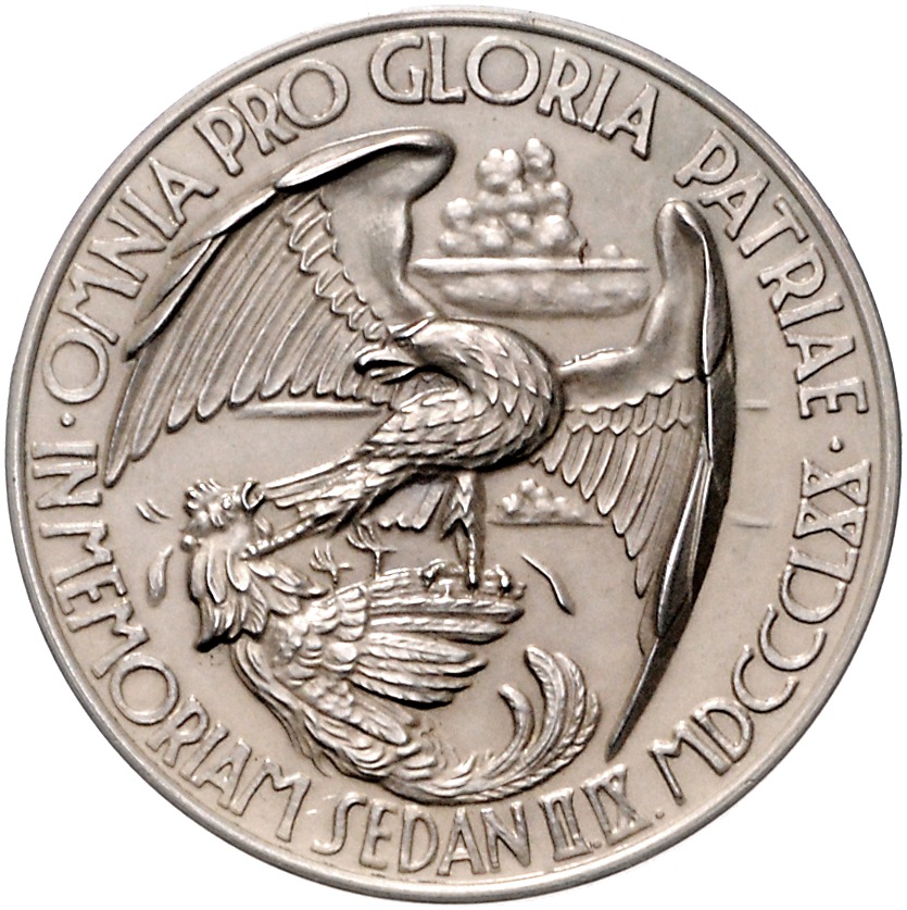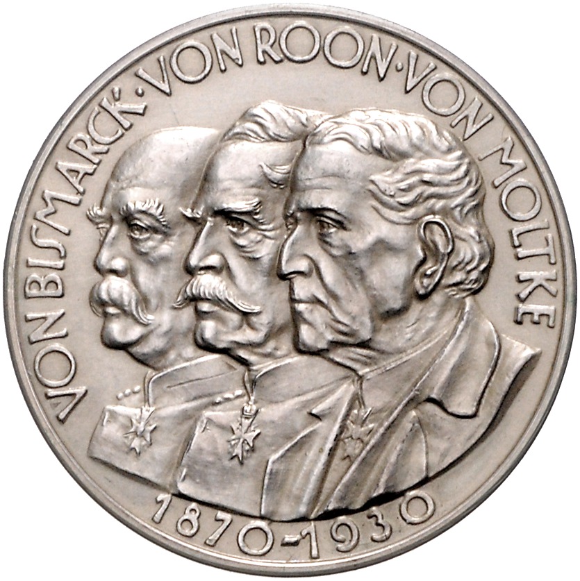 Wilhelm II. 1888-1918. Silbermedaille 1930 (v. Glöckler) auf 60 Jahre Sedanfeier, mit Brustbildern v. Bismarck, v. Roon und v. Moltke i.Rd: ST. SÄCHS. M. 900 f. mattiert 36,0 mm, 21,51 g. st