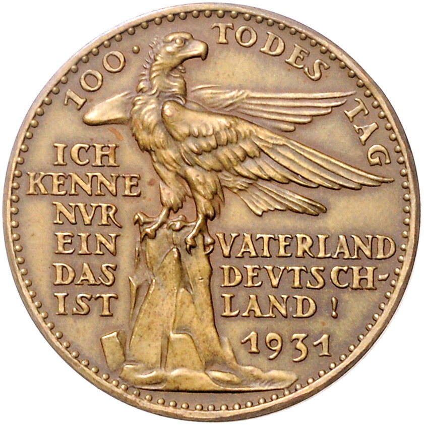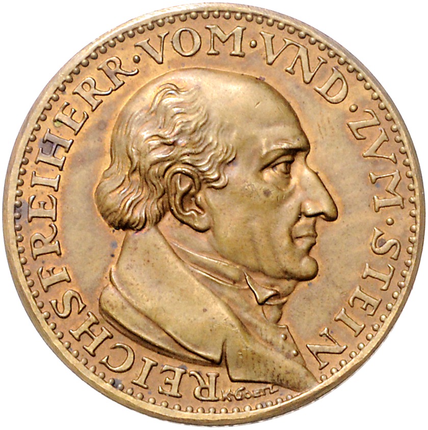 Bronzemedaille 1931 auf den 100. Todestag des Staatsmannes und Diplomaten Karl Reichsfreiherr vom und zum Stein, i.Rd: BAYER. HAUPTMÜNZAMT. Kienast 461, Slg. Böttcher 6259. 36,0 mm, 19,52 g. vz