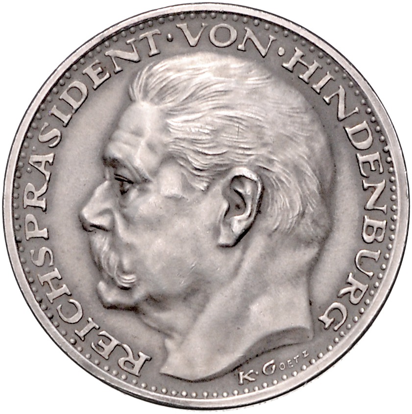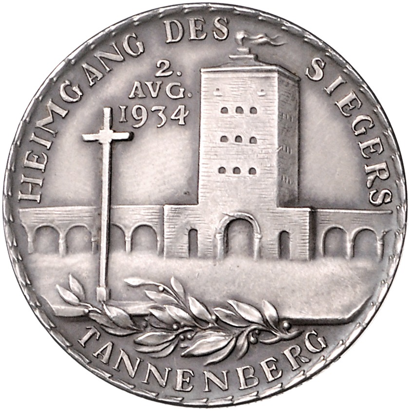 Silbermedaille 1934 auf den Tod von Paul von Hindenburg - Heimgang des Siegers, i.Rd: BAYER.HAUPTMÜNZAMT.FEINSILBER. Kienast 499, Slg. Böttcher 6376. 36,2 mm, 19,39 g. f.st