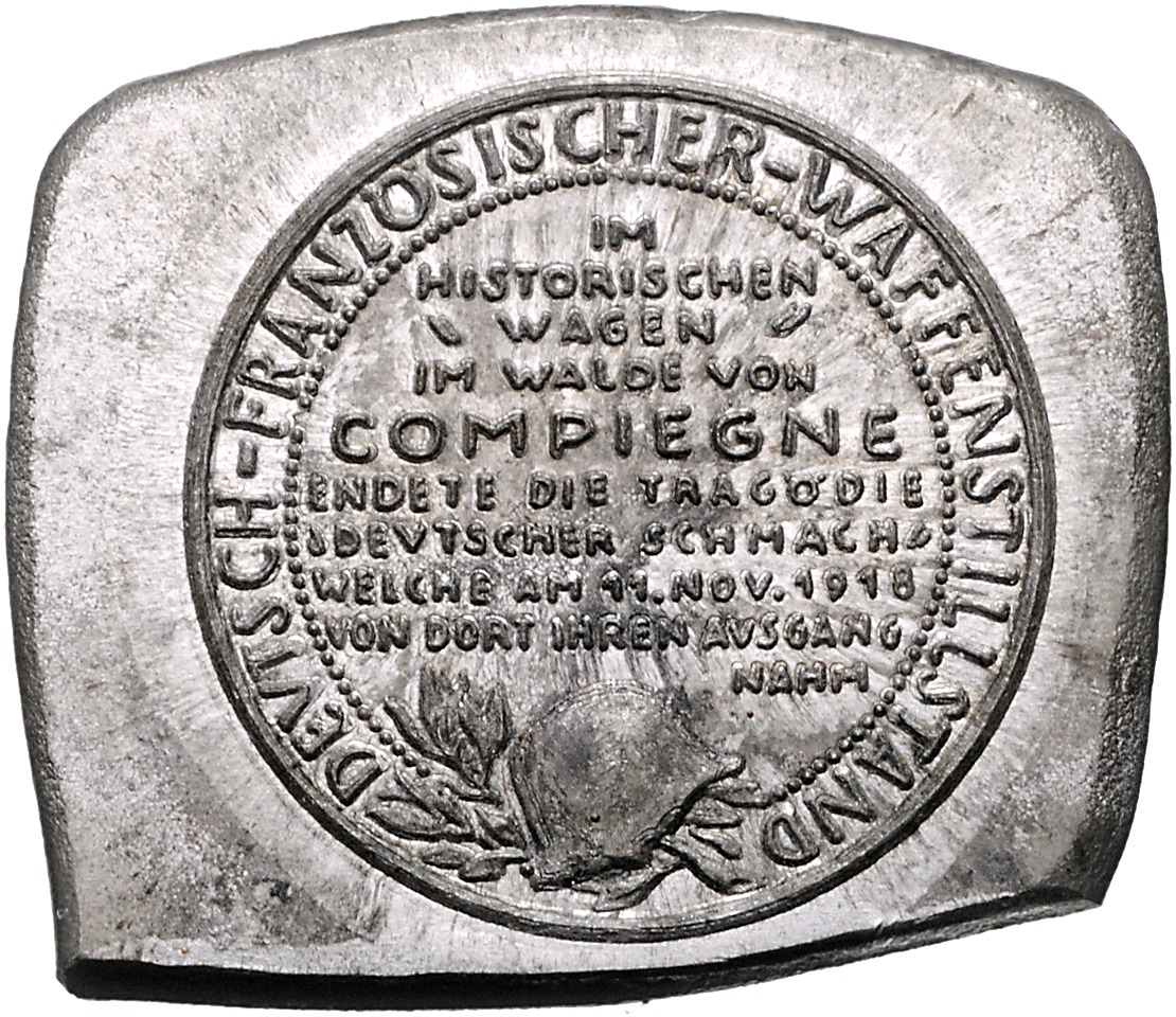 Einseitiger Probeabschlag der Rückseite der Medaille auf den Deutsch-Französischen Waffenstillstand auf quadratischer Zinnklippe mit runden Ecken. Kienast zu 576. 48x40mm 49,50 g. vz
