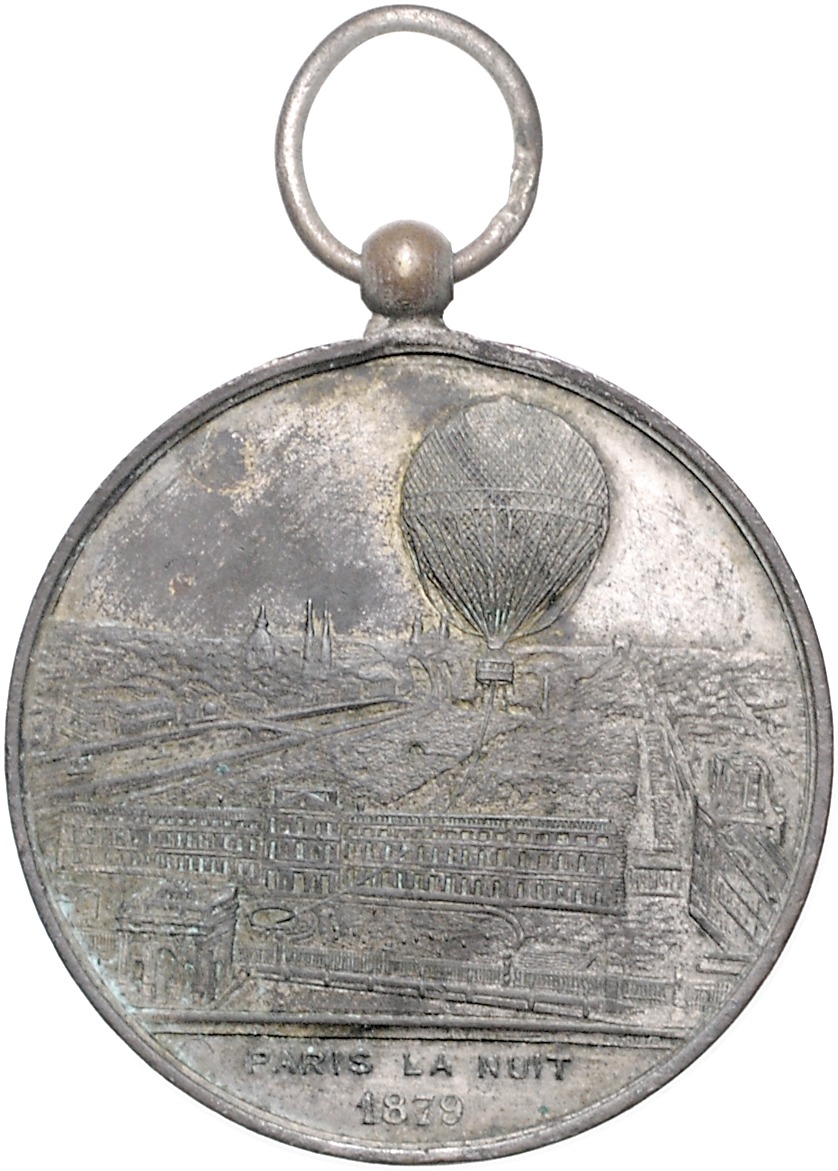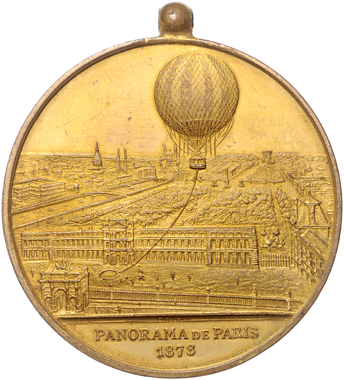 Lot von 2 Stücken: Vergoldete Bronzemedaille 1878 (v. Trotin) auf den Aufstieg mit Giffards Fesselballon bei der Weltausstellung in Paris. 51,0mm 52,78g, kl.Kr., mit Öse | Zinnmedaille 1879 (v. Trotin, unsign.) PARIS LA NUIT, sonst wie vorher. 36,2mm 17,72g, mit Öse. Button 17, Malpas 101. f.vz und ss