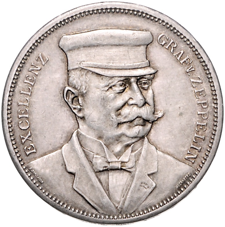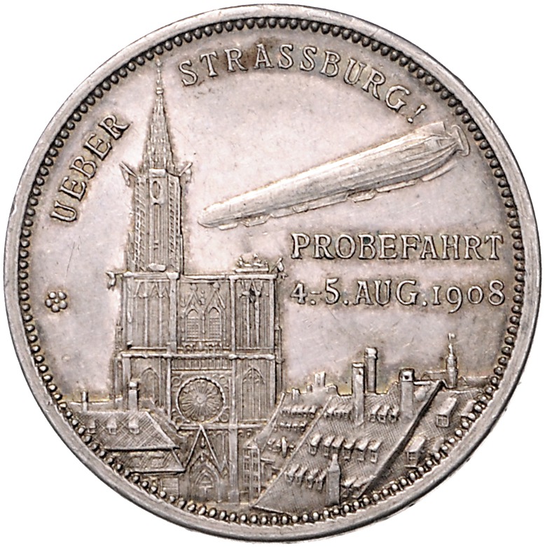 Silbermedaille 1908 (v. Lauer) auf die Probefahrt des Luftschiffes `LZ4` über Straßburg, i.Rd: EIN GEDAECHTNISS THALER SILBER 990. Kaiser 286. winz. Kr. 33,5 mm, 18,33 g. f.vz