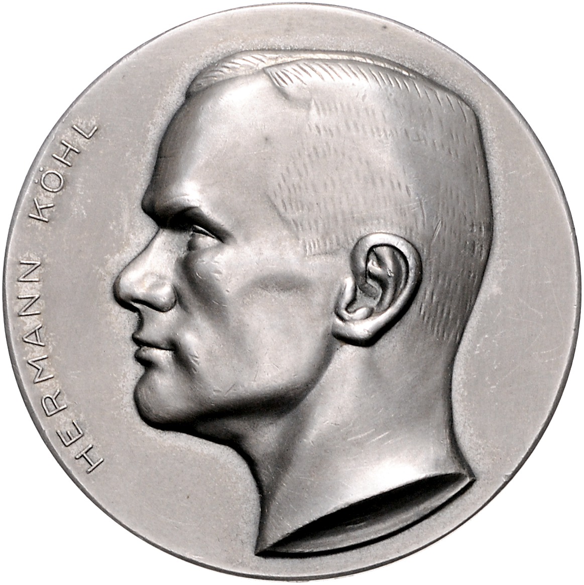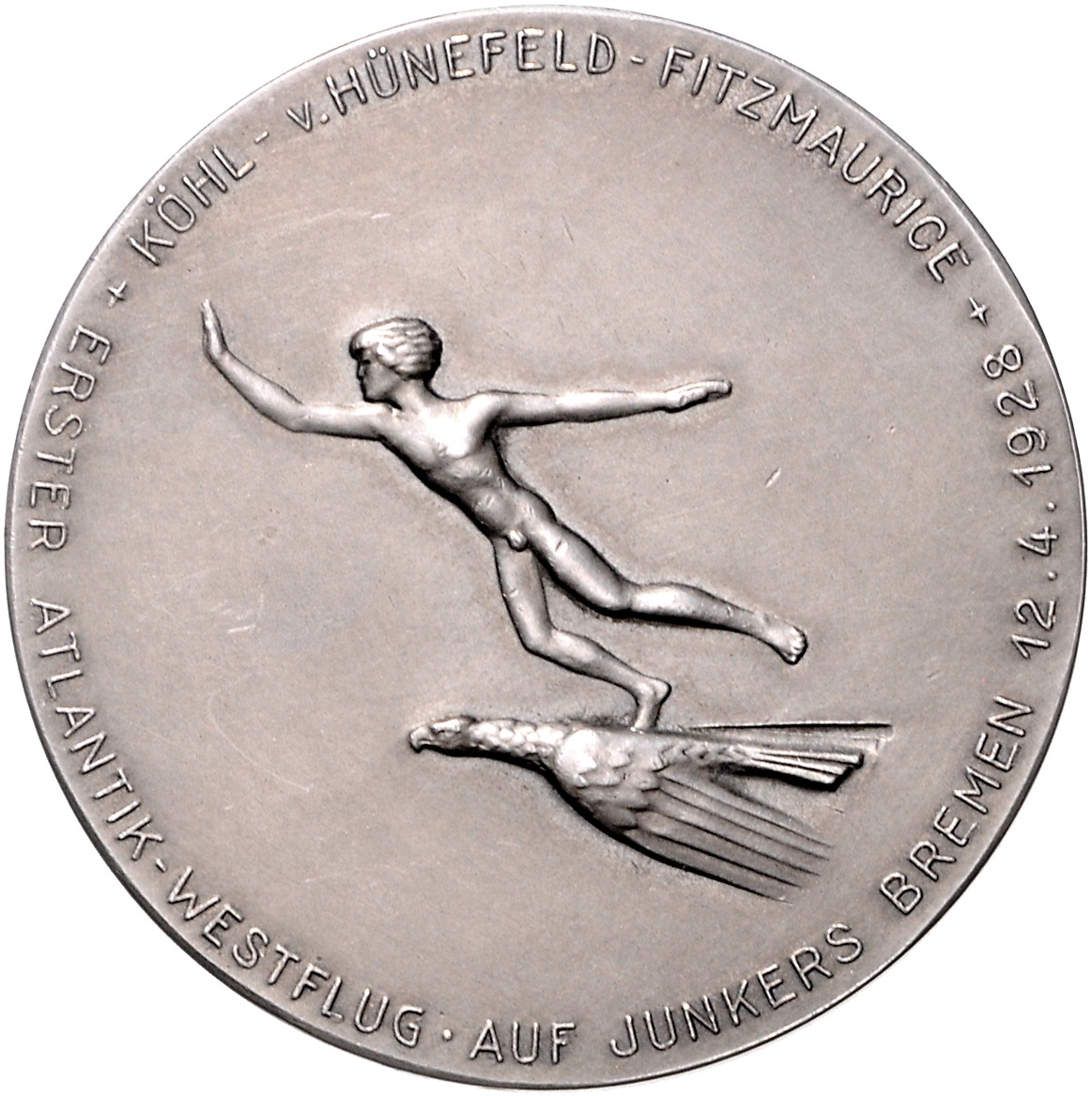 Silbermedaille 1928 (v. F.) auf Hermann Köhl, seine Begleiter und den ersten Atlantik-Westflug mit der BREMEN, i.Rd: Punze 993. Kaiser 936.1, Button 219. winz. Kr. 50,0 mm, 59,36 g. vz