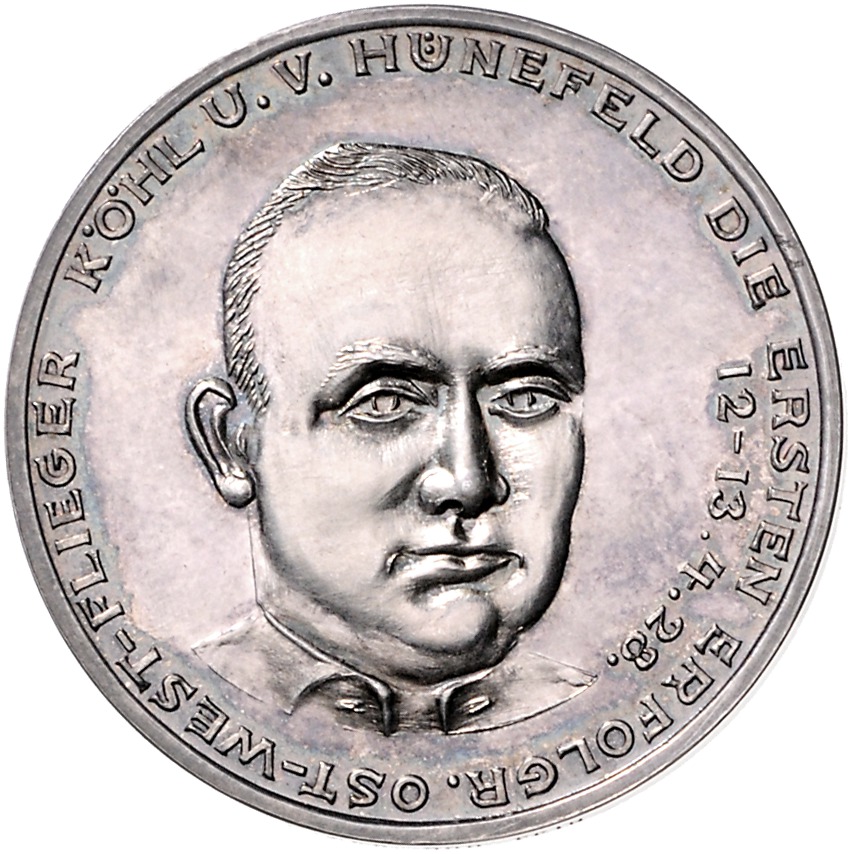 Silbermedaille 1928 (v. Glöckler) auf Köhl und Hünefeld und ihren Ost-West-Ozeanflug mit der BREMEN, i.Rd: PREUSS. STAATSMÜNZE SILBER 900 FEIN. Kaiser 938, Button 205. leicht ber. 36,6 mm, 25,00 g. vz-st