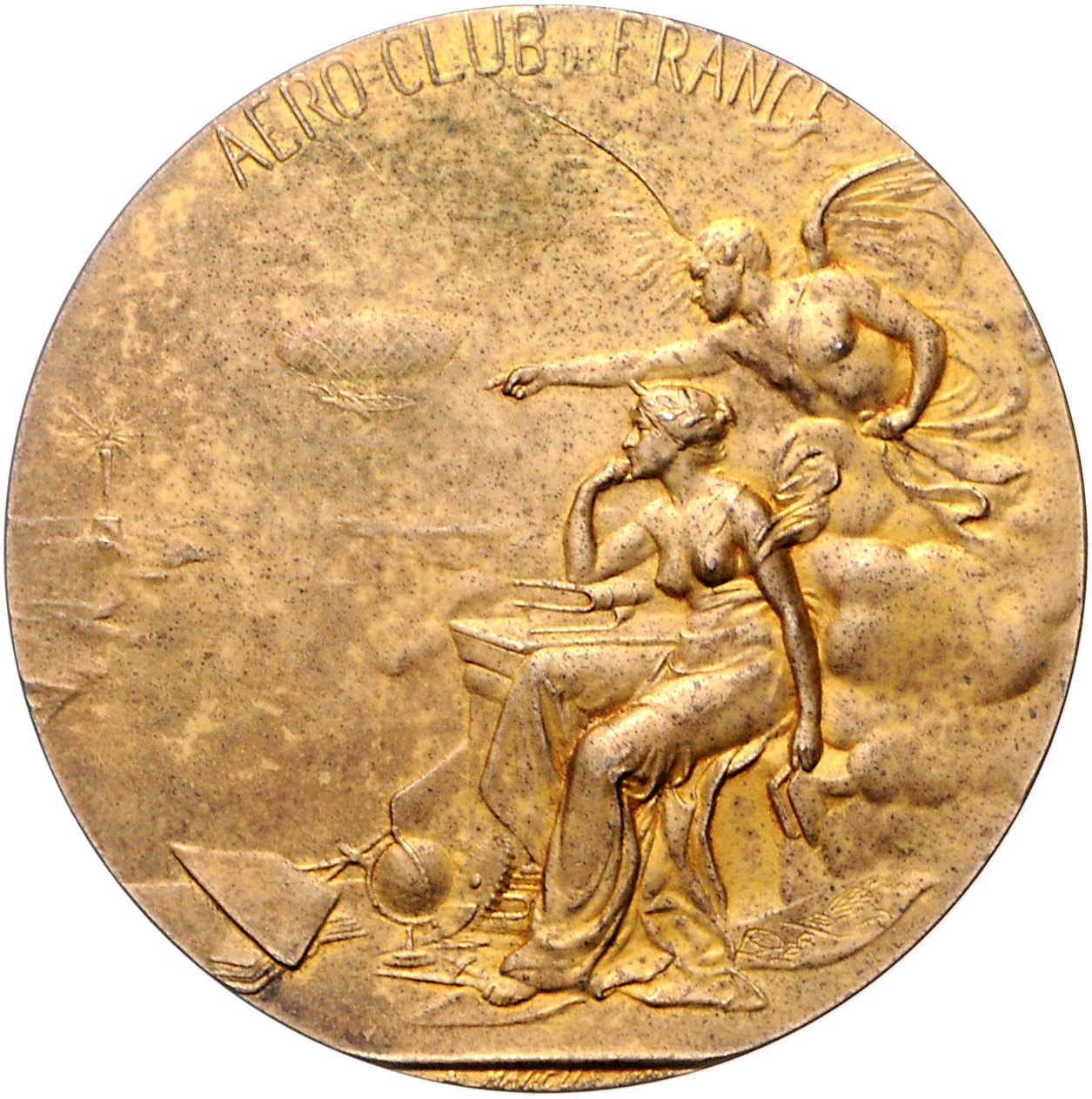 Vergoldete Silbermedaille o.J. Prämie des AERO CLUB DE FRANCE verliehen an 'M. LUCIEN ROUGERIE - MÈTHODE DE PILOTAGE - DES AVIONS - SANS VISIBILITÈ EXTÈRIEURE 1928, i.Rd: Punzen ARGENT. fleckige Patina 54,4 mm, 68,39 g. vz