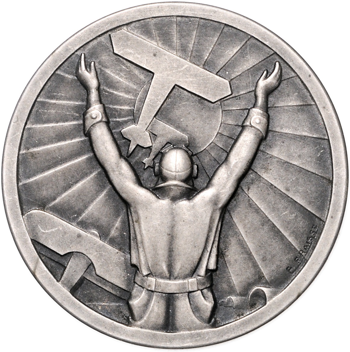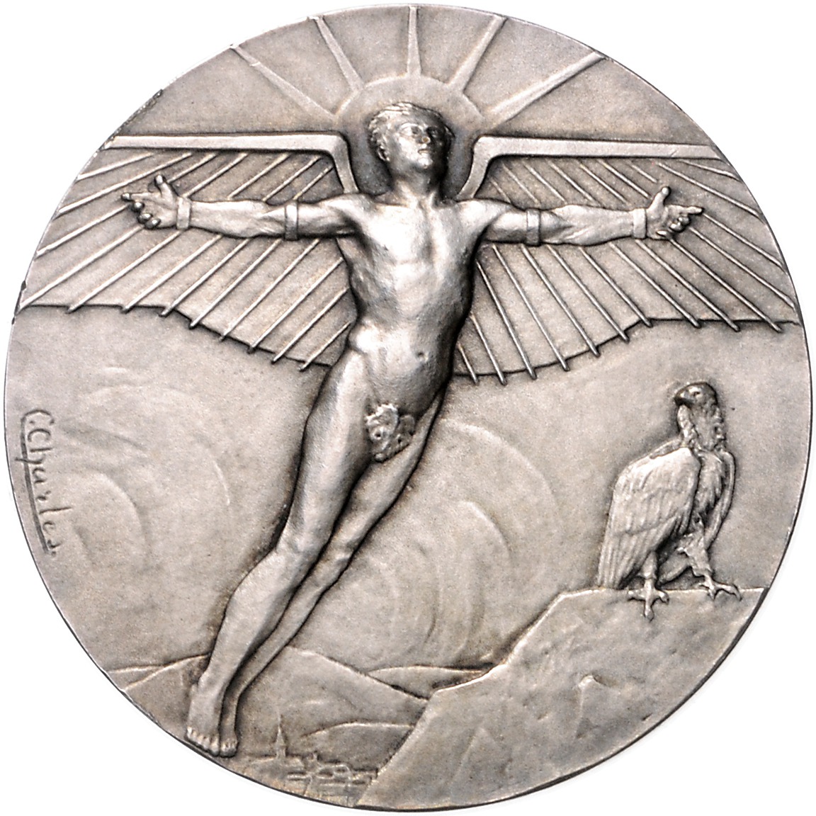 Lot von 2 Stücken: Versilberte Bronzemedaille o.J. (v. Charles) Prämie des Internationalen Hubschrauberwettbewerbs in St. Etienne, verliehen an PIERRE NOUBEL - INVENTEUR, i.Rd: Punze [B]RONZE. 49,6mm 59,39g | Versilberte Bronzemedaille o.J. (v. Fraisse) ungravierte Prämie, i.Rd: BRONZE Punze. 50,0mm 52,11g, mattiert. vz und f.vz