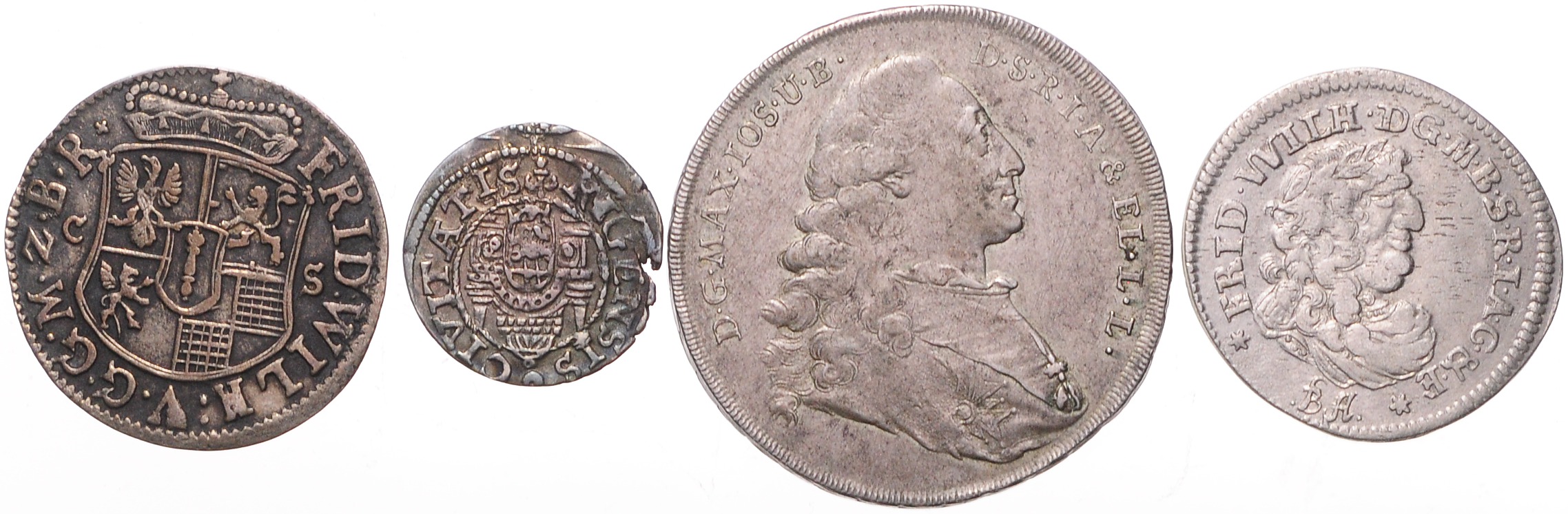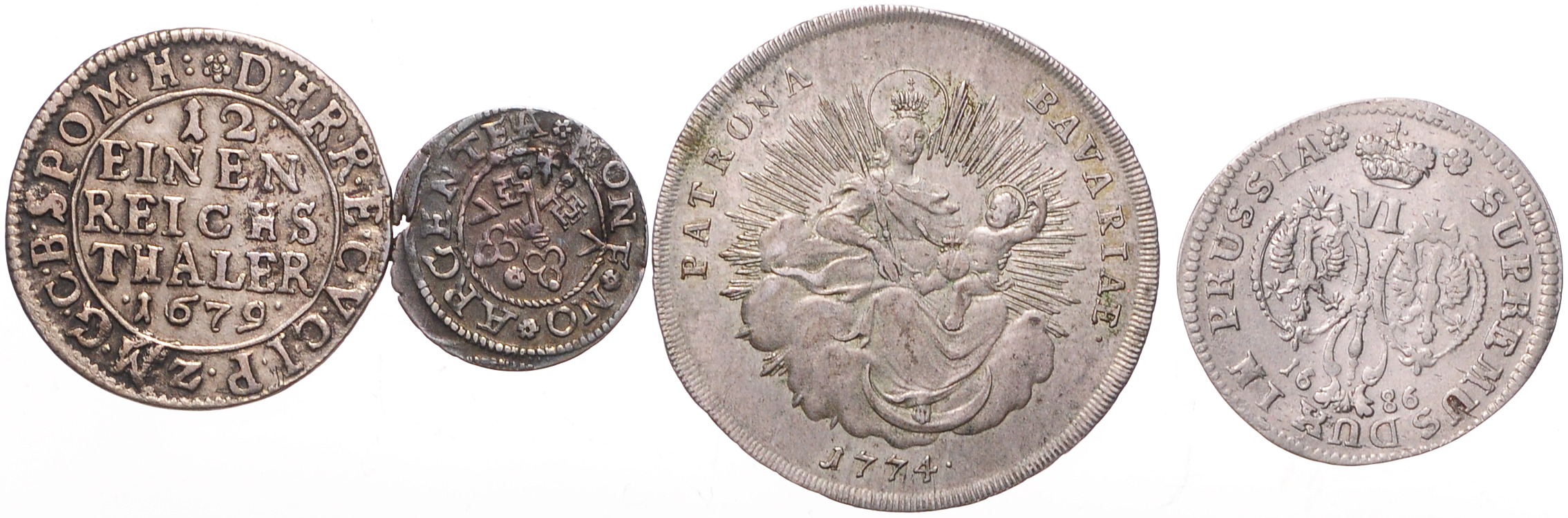 Lot von 4 Stücken: BAYERN 1/2 Madonnentaler 1774 | PREUßEN 1/12 Taler 1679 CS | PREUßEN 6 Groschen 1686 | RIGA Schilling 1577. Hahn 305, v. Schrötter 864,1842, Neumann 423. ss bis ss+