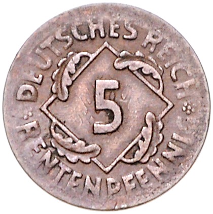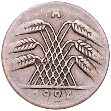 5 Rentenpfennig 1924 A geprägt auf 1 Pfennig Schrötling (J.306). Jaeger zu 308. 2,00 g. f.ss