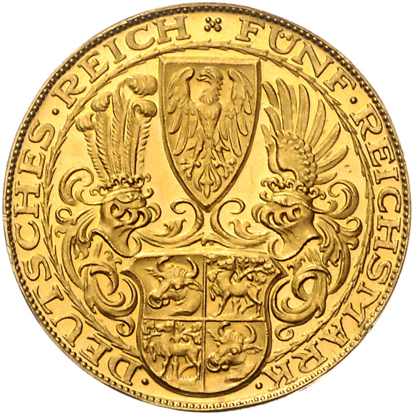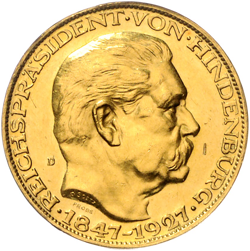 5 Reichsmark Probe in Gold (!) auf den 80. Geburtstag des Reichspräsidenten Hindenburg, Portraitseite im Halsabschnitt K. GOETZ PROBE. Wappenseite mit der seltenen Umschriftvariante DEUTSCHES REICH FÜNF REICHSMARK, i.Rd: BAYER. HAUPTMÜNZAMT 985f. kl.Rf. und Kr., in Gold außerordentlich selten 19,85 g. vz