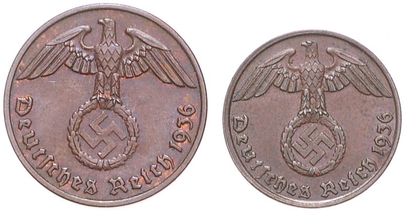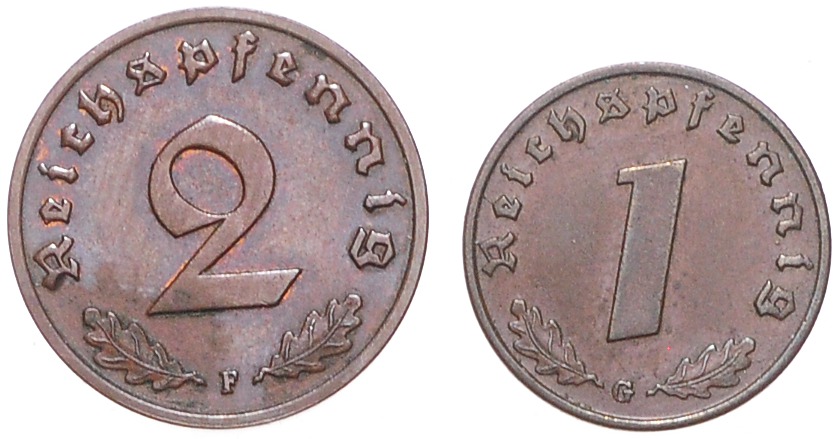 Lot von 2 Stücken: 1 Reichspfennig 1936 G und 2 Reichspfennig 1936 F. Jaeger 361,362. ss-ss+