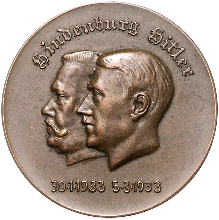 Bronzemedaille 1933 (unsign.) Köpfe von Hindenburg und Hitler / Für ein freies - geeintes und stolzes - Deutschland - Hitler. C/H C-33. 36,2 mm, 20,49 g. vz