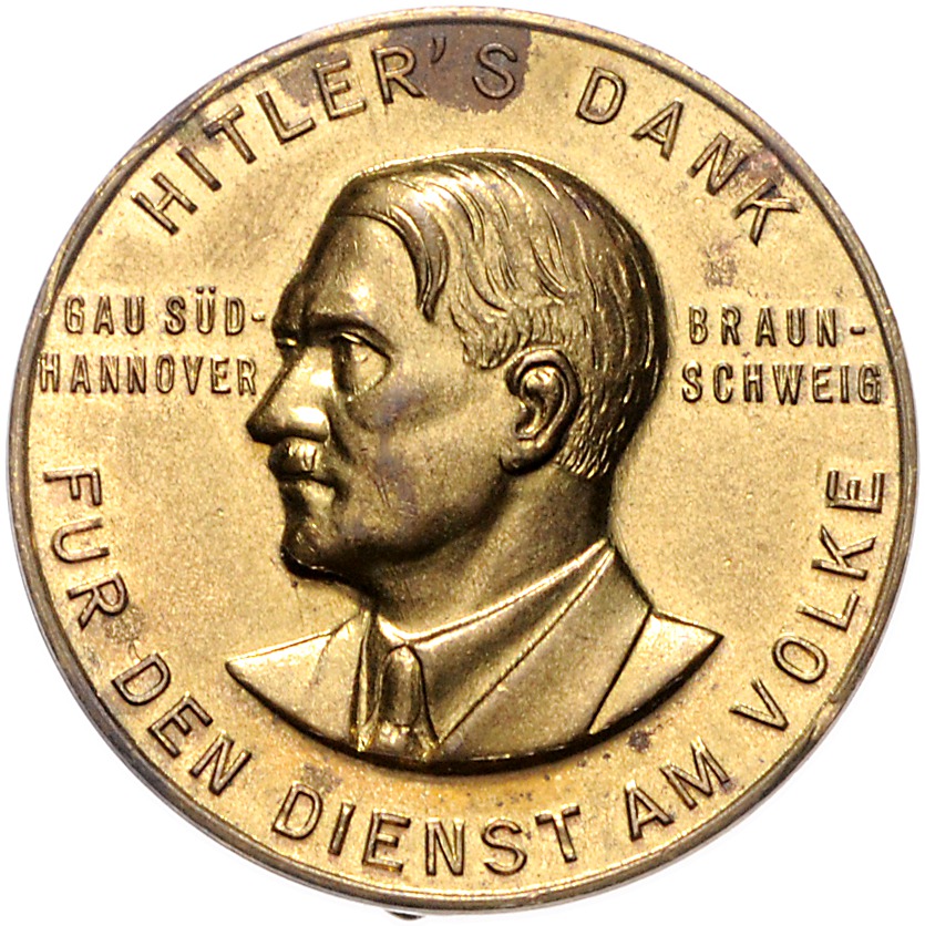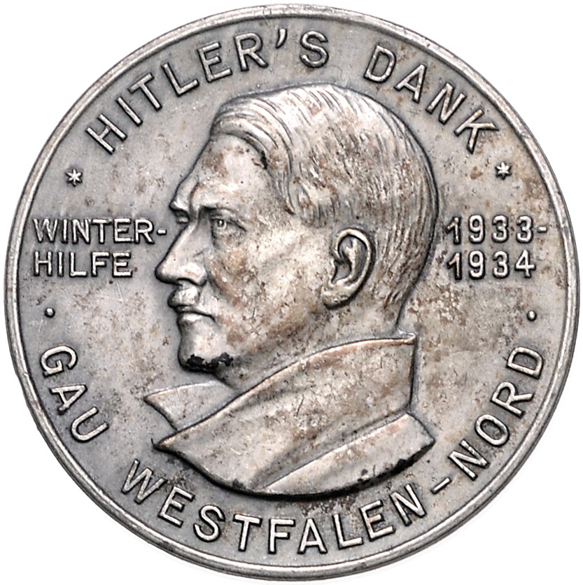 - description: Lot von 3 Stücken: Bronzierter Anstecker des Gaues Südhannover-Braunschweig `Hitlers Dank für den Dienst am Volke`, rückseitig Hersteller: Paulmann & Crone, Lüdenscheid, ges. gesch. | Versilberter Anstecker des Gaues Westfalen-Nord `Hitlers Dank / Winterhilfe 1933/1934`, rückseitig Hersteller: Paulmann & Crone, Lüdenscheid, ges. gesch. | Bronzeanstecker des Reichsparteitages 1935, rückseitig Hersteller: LN 1790 Lauer, Nürnberg. C/H C-210, C-211, C-214. alle mit intaktem Nadelsystem. ss und etwas besser