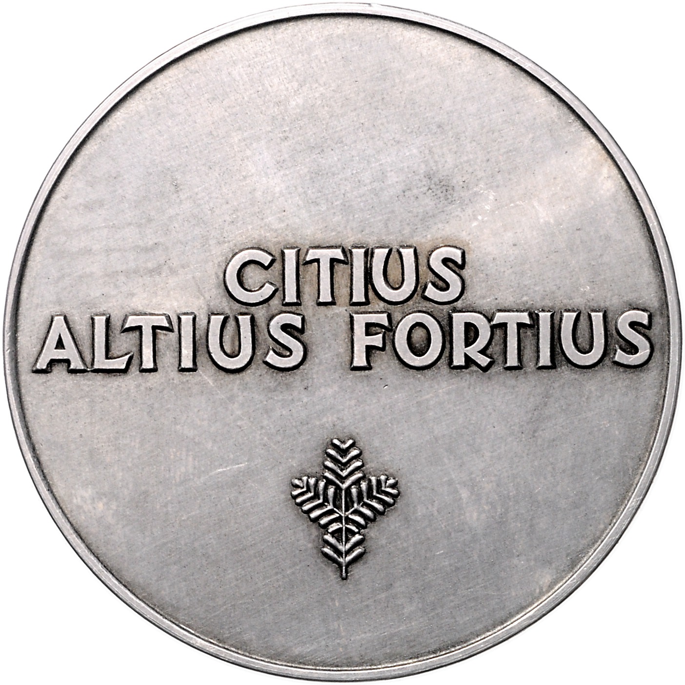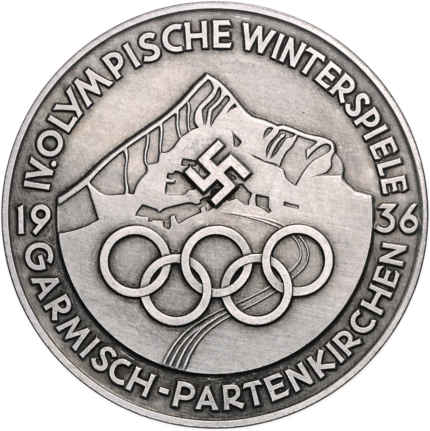 Versilberte Bronzemedaille 1936 auf die IV. Olympischen Winterspiele Garmisch-Partenkirchen. Sehr seltene Teilnehmermedaille in Silber für Funktionäre. 60,5 mm, 66,40 g. st