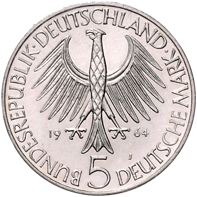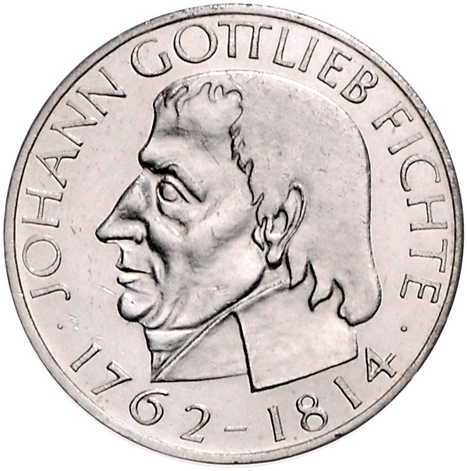 5 DM 1964 J Zum 150. Todestag des Philosophen Johann Gottlieb Fichte. Jaeger zu 393. Prägung mit glattem Rand ohne Randinschrift. Nur sehr wenige Exemplare bekannt. vz-st