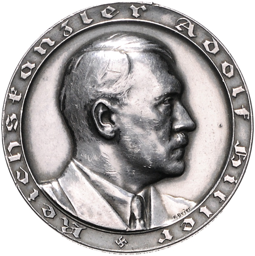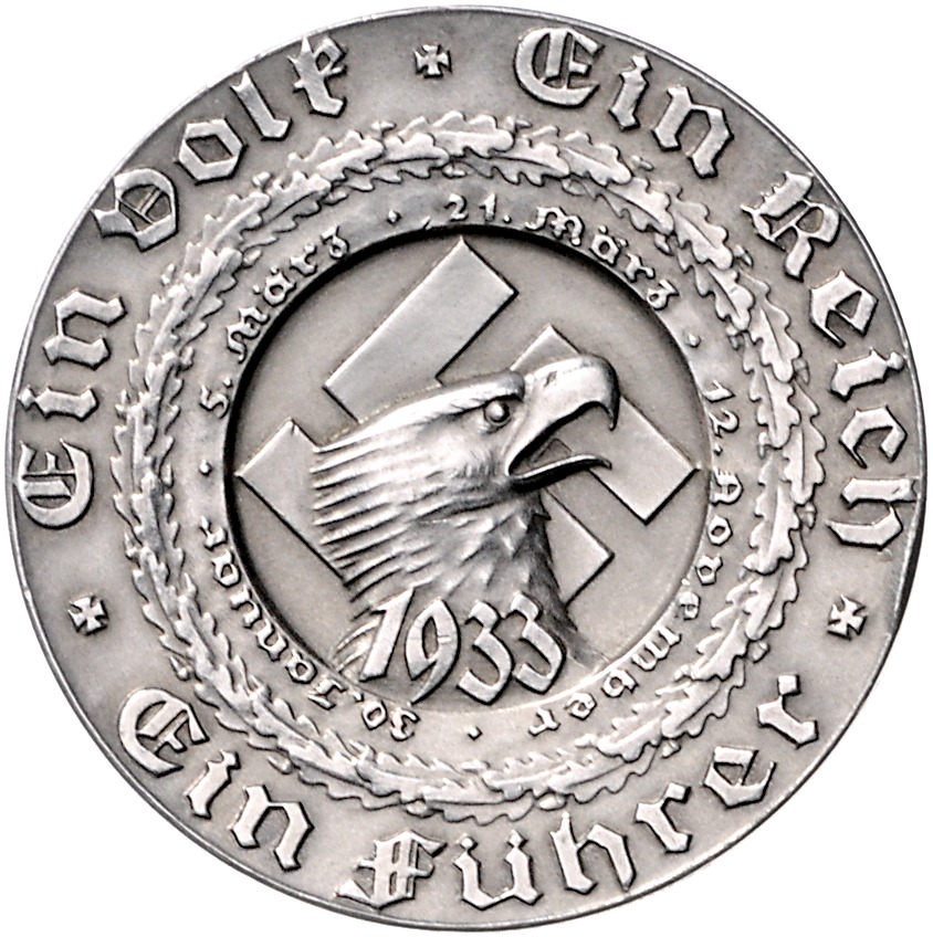 Silbermedaille 1933 (v. Beyer) auf die politischen Ereignisse des Jahres, i.Rd: PREUSS. STAATSMÜNZE FEINSILBER. C/H C-47. 36,2 mm, 24,48 g. ss-vz/vz