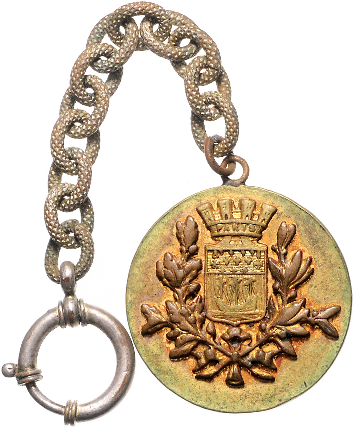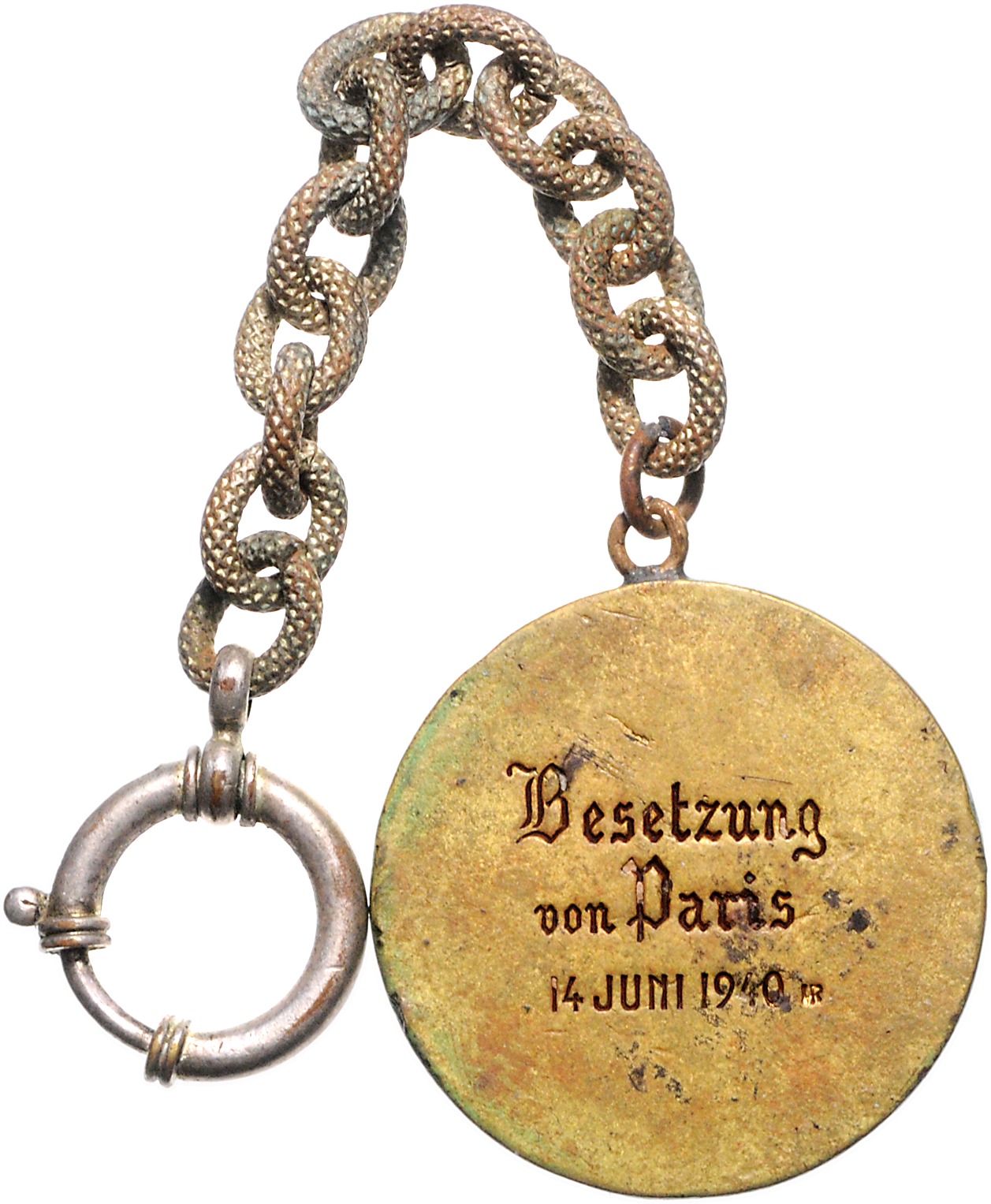 Vergoldeter Bronzeanhänger an metallenem Kordelband `Besetzung von Paris 14. Juni 1940`. 34,2 mm, 16,67 g. ss