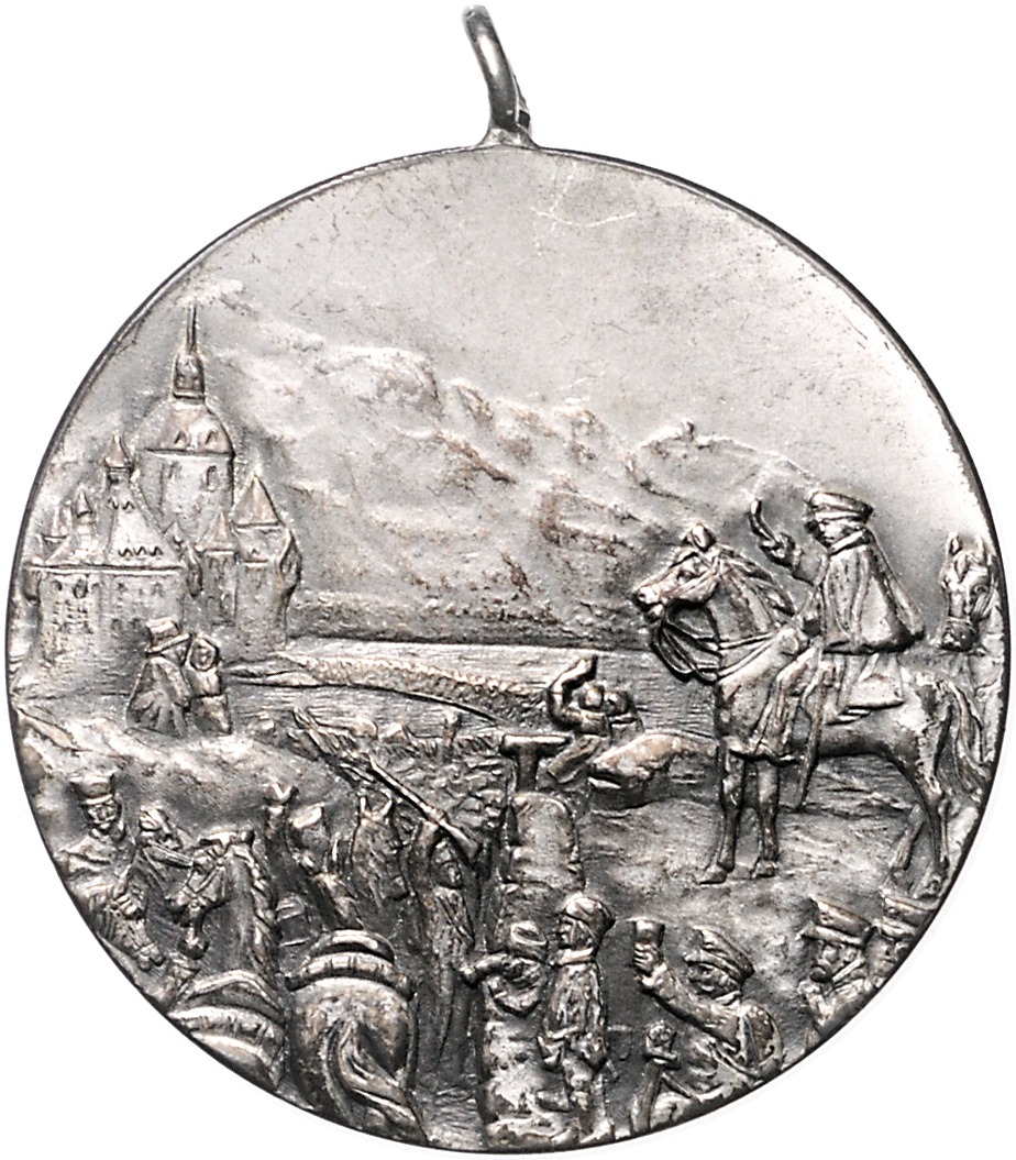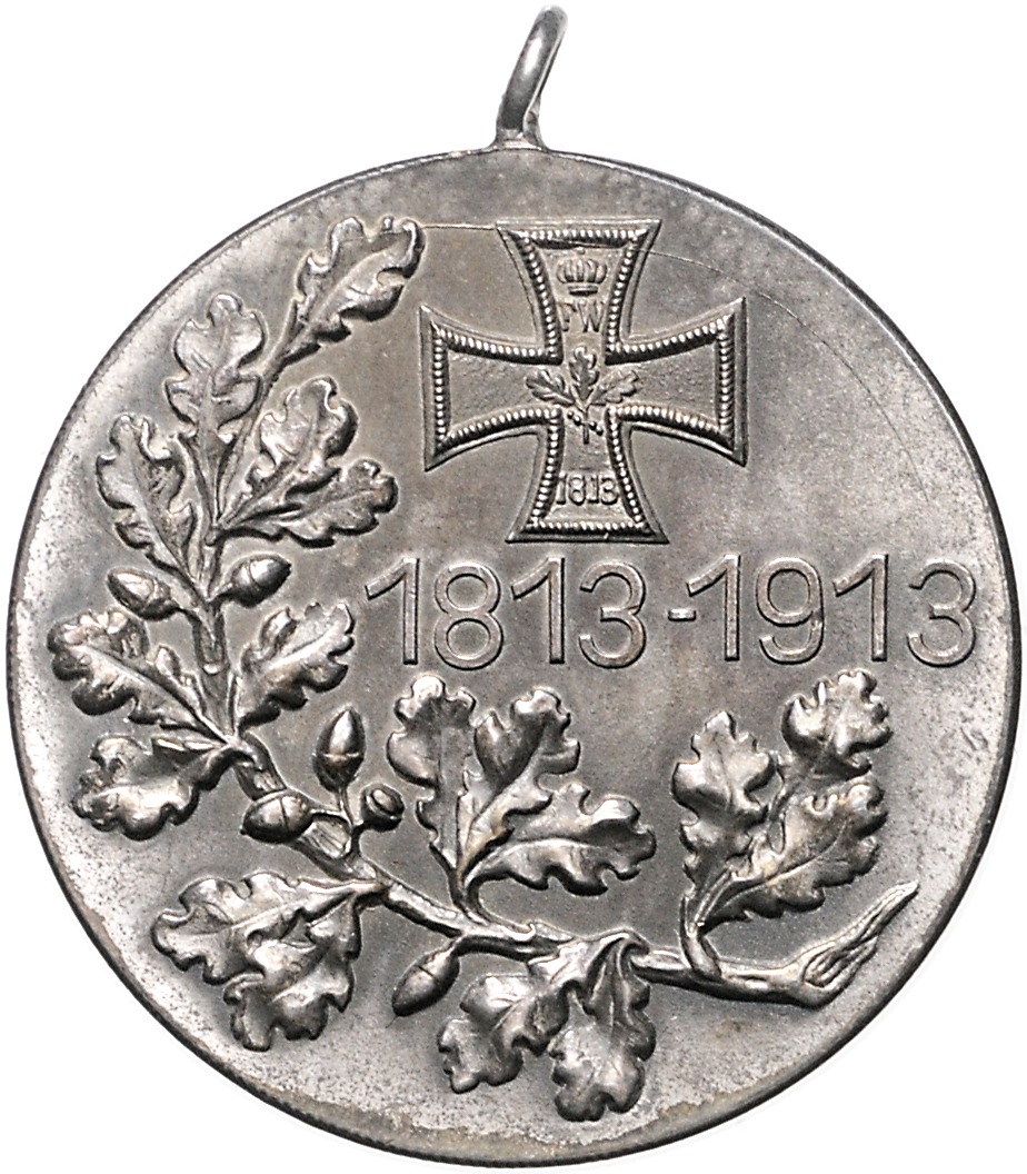 Lot von 2 Stücken: Versilberte Medaille 1913 (unsign.) auf die 100-Jahrfeier der Befreiungskriege (mit Öse 39,6mm 30,59g) und Bronzemedaille 1913 (v. M.&W.) gleicher Anlass (mit Öse 28,6mm 8,5g). vz