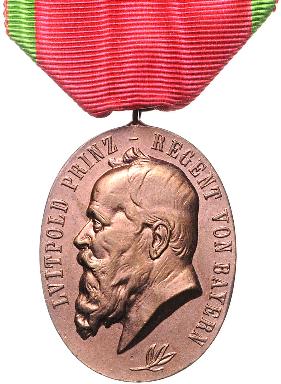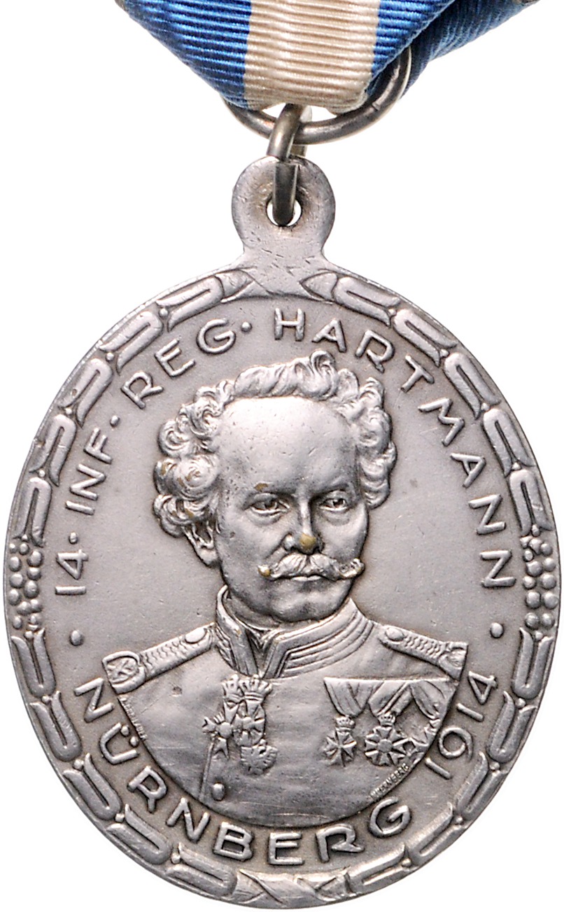 Lot von 2 Stücken: Bayern, Prinz-Luitpold-Medaille in Bronze an grün-rotem Band | Versilberte Medaille Nürnberg 1914 - 14. Inf. Regiment Hartmann, an blau-weiß-blauem Band. OEK 461. prfr.