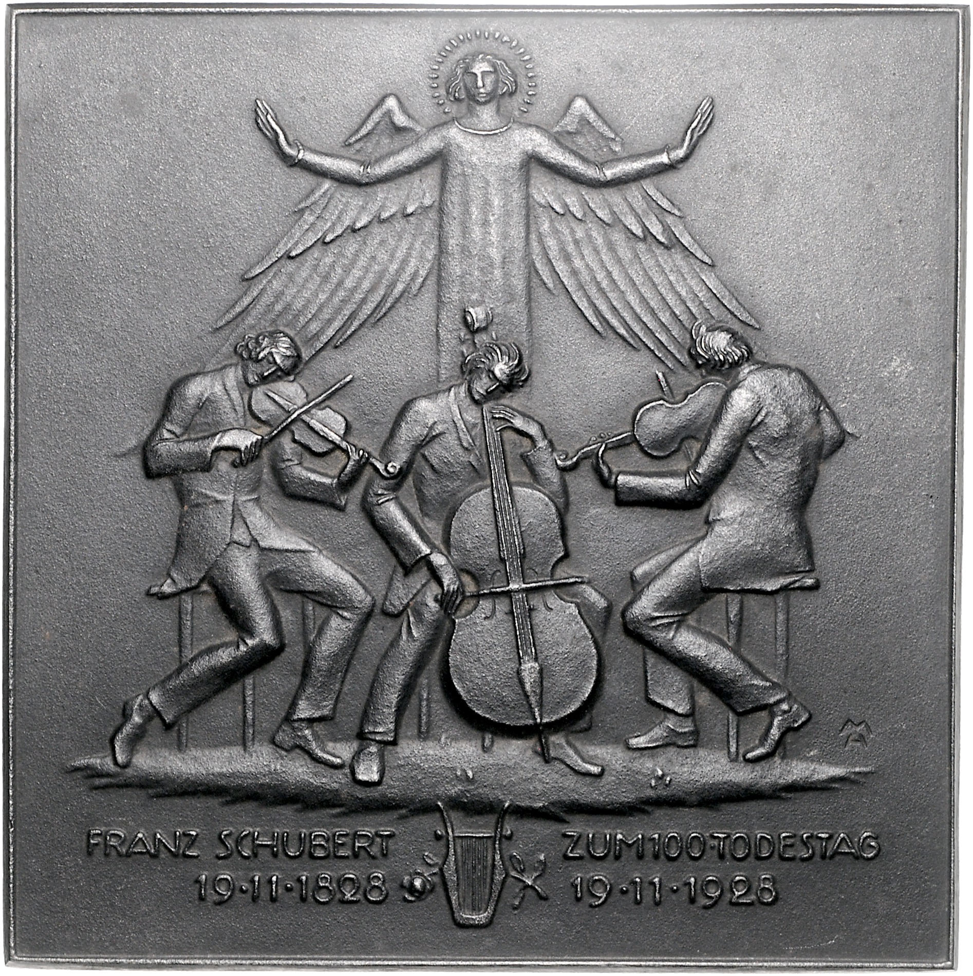 Schubert, Franz Peter 1797-1828. Einseitige, geschwärzte Eisenhohlgussplakette 1928 (v. MH = Heinrich Moshage) auf seinen 100. Todestag. Niggl 1817. mit Aufhängevorrichtung, 125,0x126,0 mm 218,49 g. gutes vz