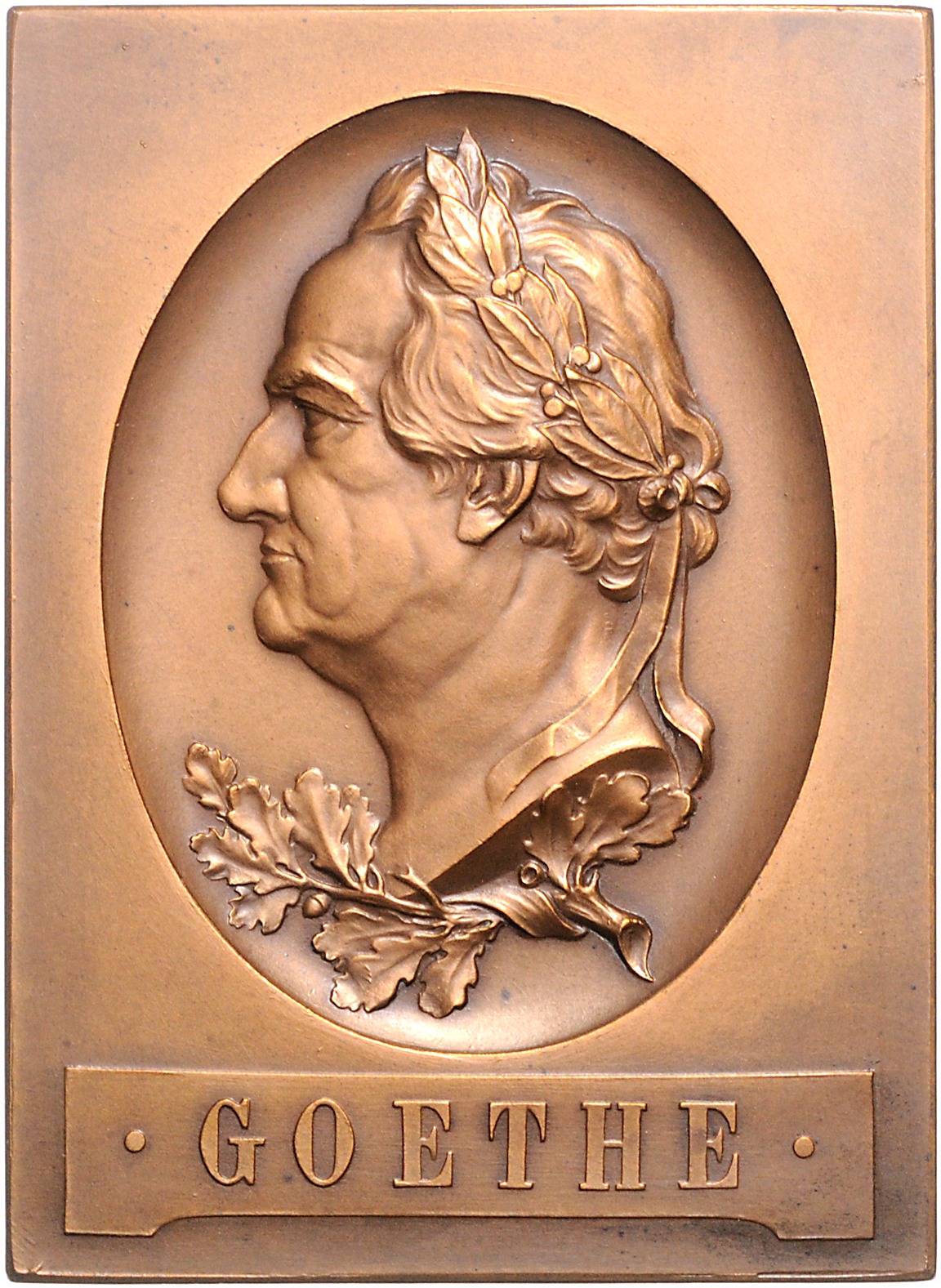 Goethe, Johann Wolfgang von 1749-1832. Einseitige Bronzeplakette o.J. (unsign. v. M. & W.) Belorbeerter Kopf in Oval. Förschner 299, Kaiser 161. 49,5x67,8 mm 82,83 g. vz-st