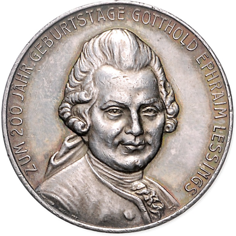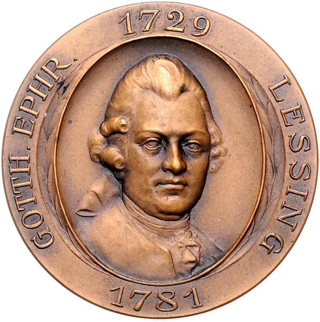 Lessing, Gotthold Ephraim 1729-1781. Lot von 3 Stücken: (v. Lauer) auf seinen 200. Geburtstag, i.Rd: 990 (33,4mm 17,92g) | Bronzemedaille 1929 (v. WS = Schlender/Verlag Ball) gleicher Anlass (36,1mm 19,75g) | Bronzemedaille 1929 (unsign.) gleicher Anlass (45,1mm 33,88g). ss-vz bis st