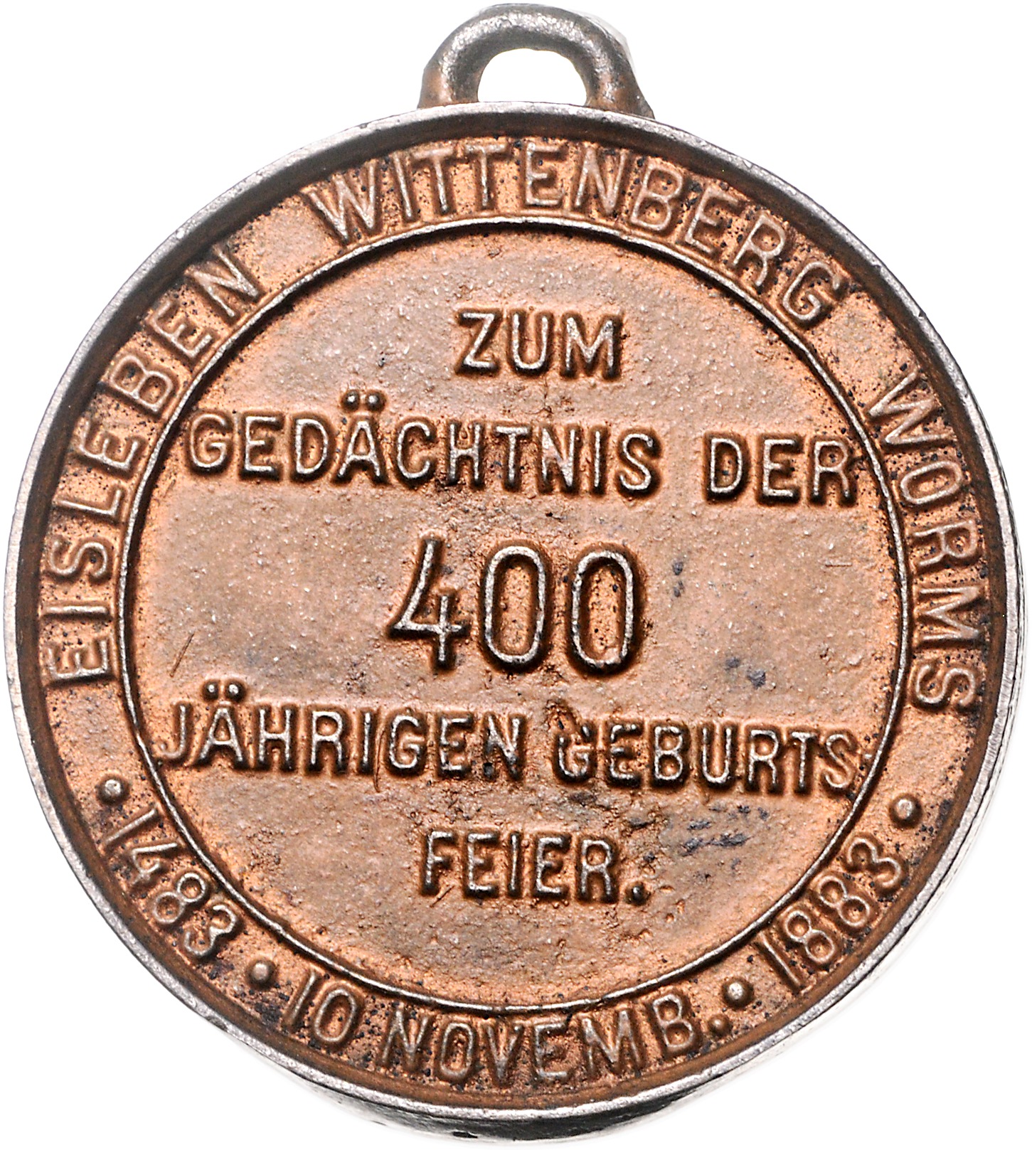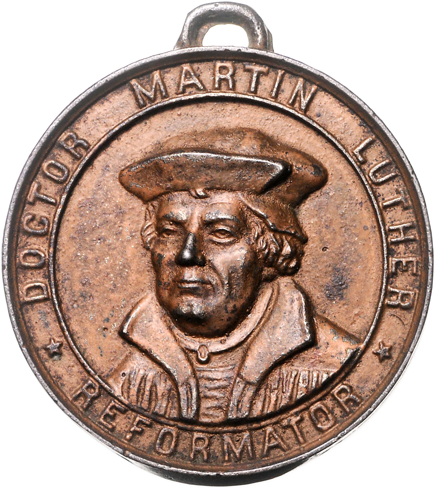 Bronzierte Eisengussmedaille 1883 (Guss Carlshütte bei Rendsburg) auf den 400. Geburtstag von Martin Luther, herausgegeben von der herzoglichen Vorschule in Dessau. Brozatus 41, Slg. Whiting 769. mit angegossener Öse 62,2 mm, 103,44 g. vz