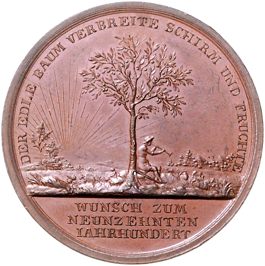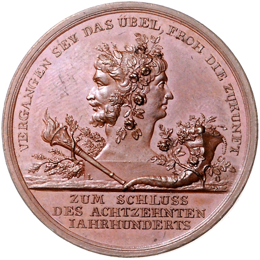 Bronzemedaille o.J. (v. Loos) Zur Jahrhundertwende `Zum Schluss des achtzehnten Jahrhunderts / Wunsch zum neunzehnten Jahrhundert`. Sommer B77/2. 36,5 mm, 18,88 g. st