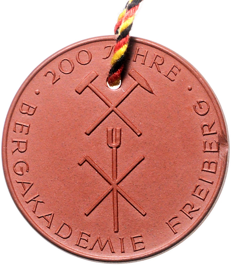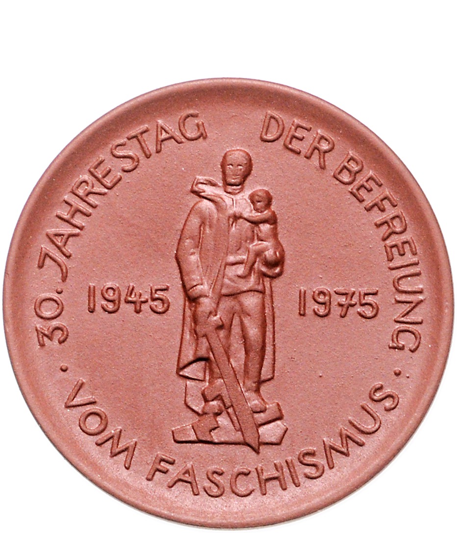 Lot von 2 braunen Porzellanmedaillen: (beide von Meissen) auf 200 Jahre Bergakademie Freiberg / Montanwissenschaftliche Festtage 9.-14. Nov. 1965 (gelocht mit Band 40,6mm 12,49g) und auf den 30. Jahrestag der Befreiung vom Faschismus / Bergakademie Freiberg DDR (40,0mm 9,7g). Müseler 15.4/24. prfr.