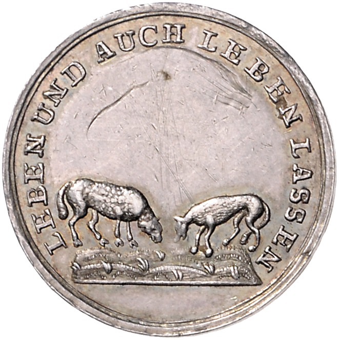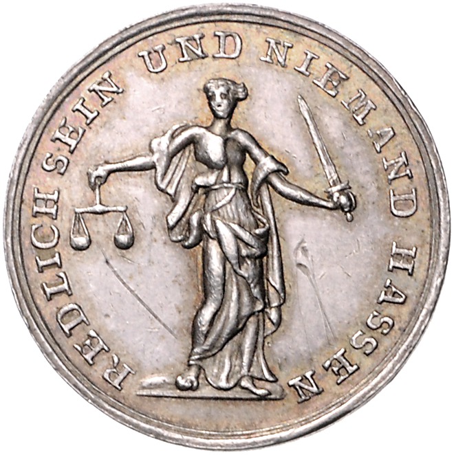Silbermedaille o.J. Gerechtigkeit und Moral REDLICH SEIN UND NIEMAND HASSEN / LEBEN UND AUCH LEBEN LASSEN. Kr. 28,3 mm, 7,26 g. ss