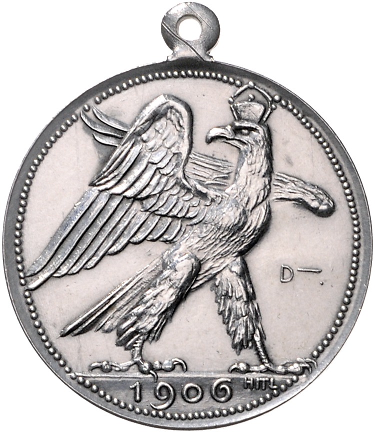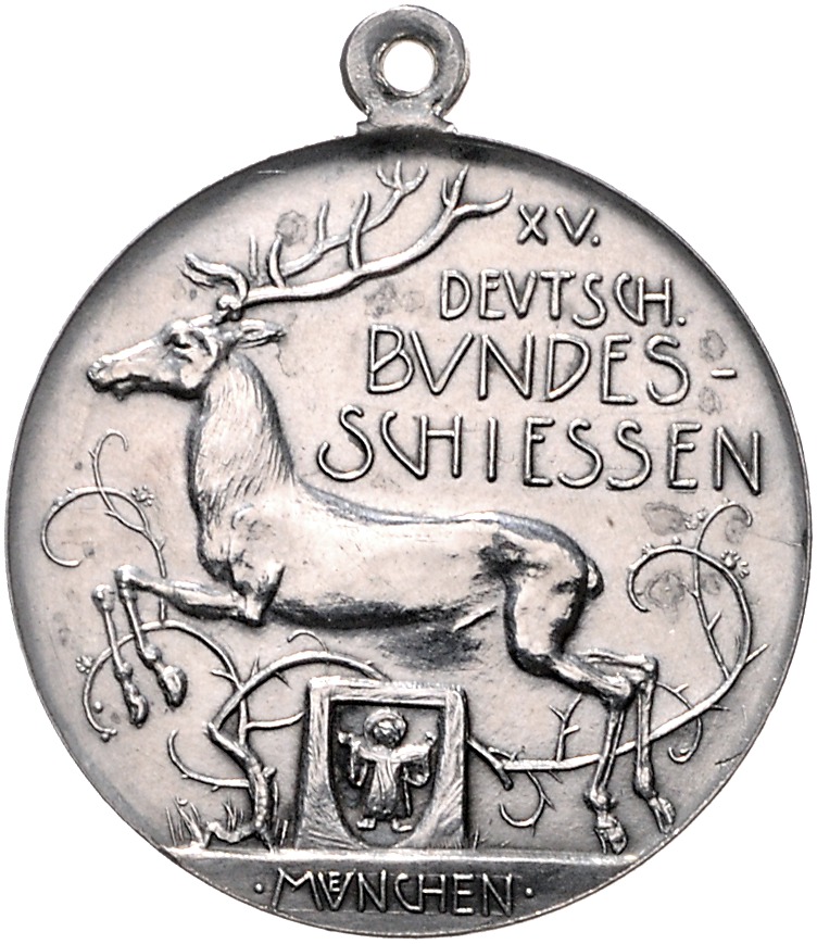 Silbermedaille 1906 auf das XV. Bundesschießen in München. Weber 76, Steulmann 7, Slg. Peltzer 1494/95. mit Öse 32,2 mm, 12,60 g. vz