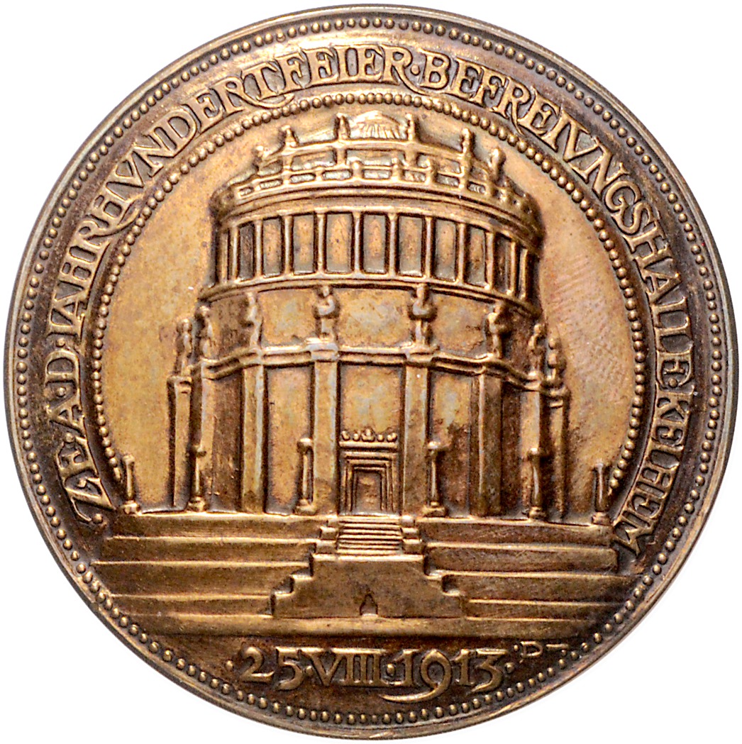 Lot von 4 Bronzemedaillen: 1910, auf 100 Jahre Oktoberfest. 32,0mm 18,66g | 1912, auf 25 Jahre KUNSTWART. 32,1mm 14,3g | 1913, auf 100 Jahre Befreiungshalle Kelheim. 45,0mm 41,76g, vergoldet | 1918, auf 100 Jahre Verfassung (mit Schwegerle). 33,1mm 16,67g. Weber 78, 75, 66, 72. meist vz