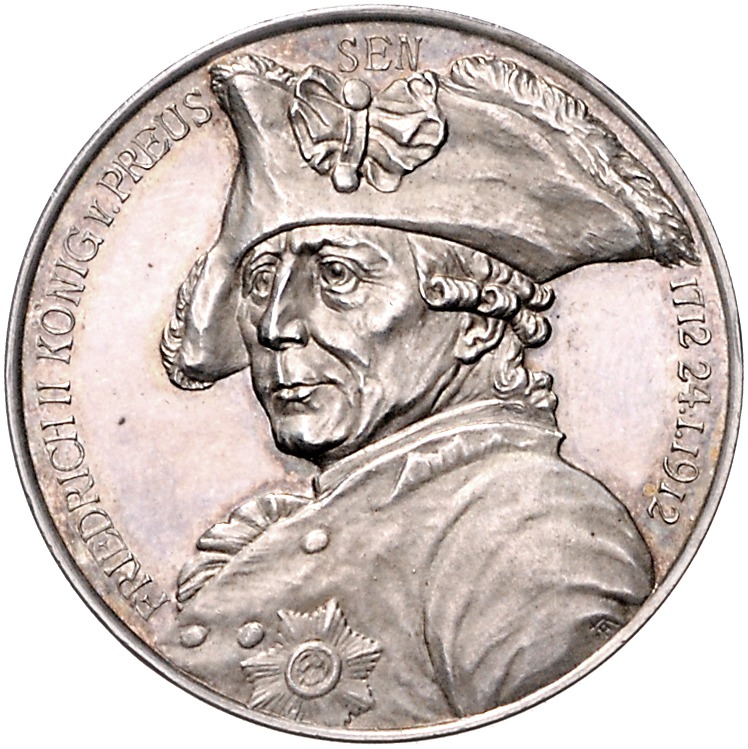 Friedrich II. 1740-1786. Silbermedaille 1912 (v. Hummel/Lauer) auf seinen 200. Geburtstag, i.Rd: SILBER 990. Slg. Marienburg -, Heidemann 689. kl. Kr. 32,1 mm, 17,78 g. vz