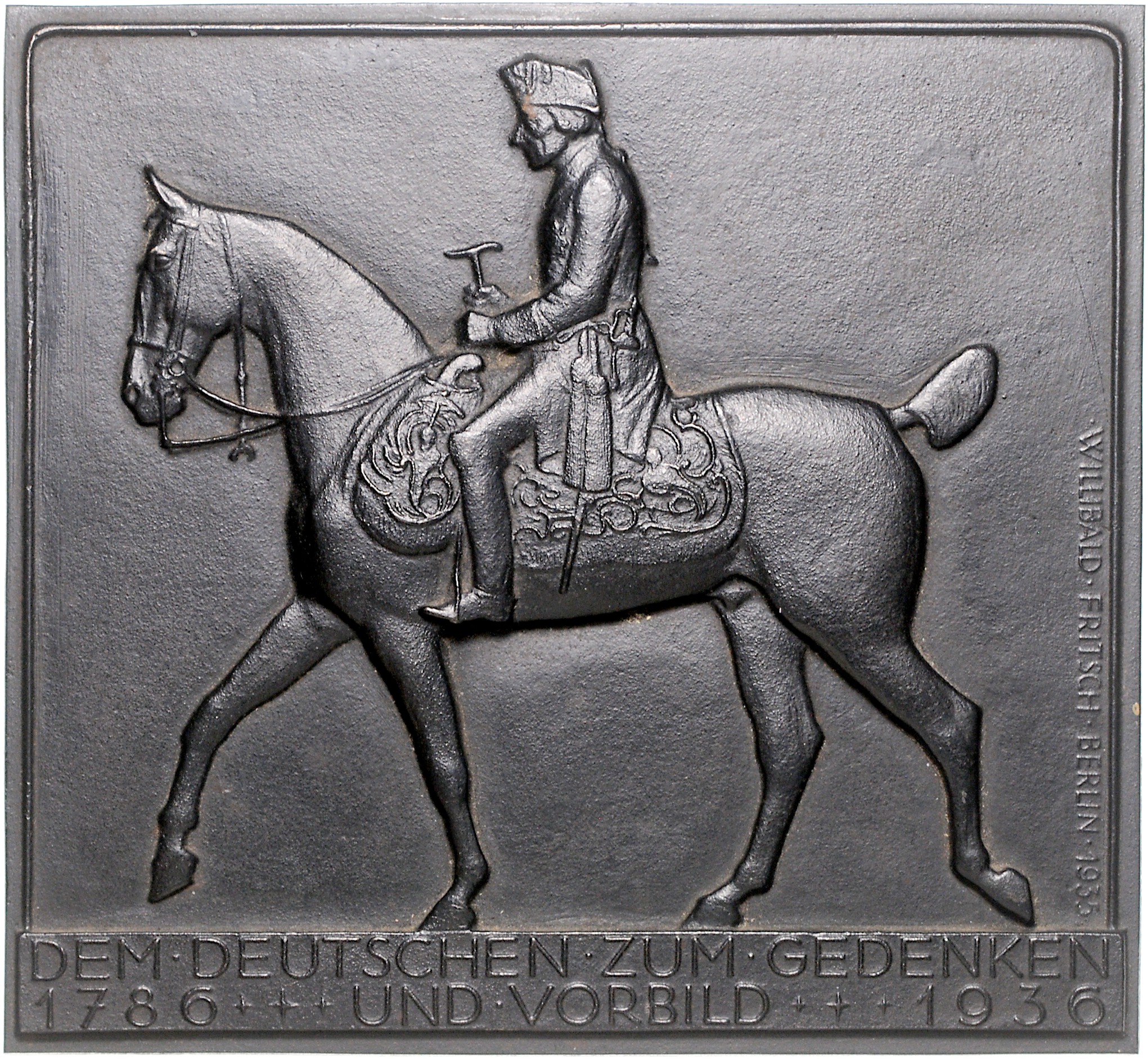 Friedrich II. 1740-1786. Einseitige Eisengussplakette 1936 (1935 v. W. Fritsch/Gleiwitz) auf seinen 150. Todestag, mit rückseitiger Aufhängevorrichtung. 135,2x124,6mm 271,00 g. gussfrisch