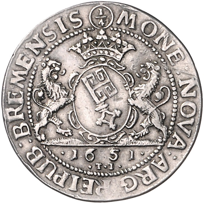 1/4 Taler 1651 T.I. mit Wertzahl. Jungk 514. l.Fass.Sp., kl.Stf. ss+