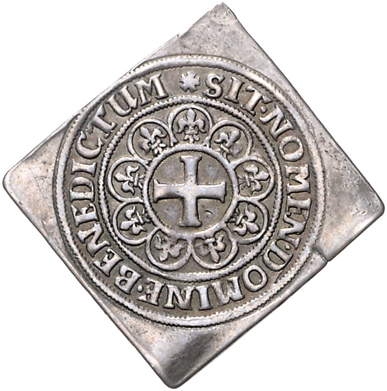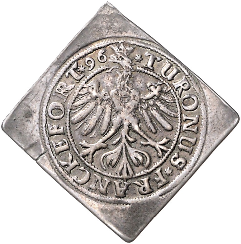 Turnosklippe 1596 Exemplar der Slg. Willy Fuchs mit Original-Unterlagszettel mit Vermerk `einziges Exemplar im Handel, zuvor Slg. Ruland` und Exemplar der Slg. Seif (Helbing Nov. 1928 Nr. 3049 Z= 260 RM !!!). J.u.F. 255b. winzige Hklsp., 25,4x24,3mm, feine Patina, außerordentlich selten 4,89 g. ss-vz