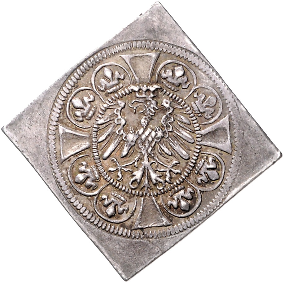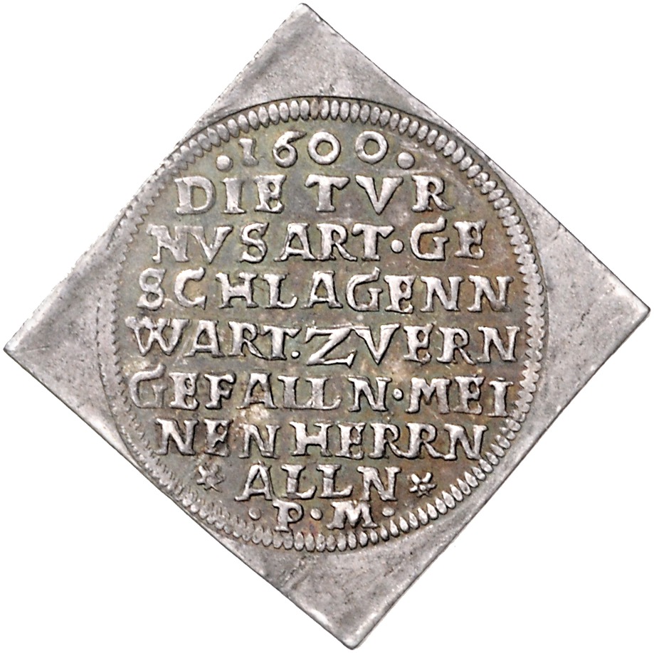 Klippe 1600 auf die Turnosenprägung, Mzm. Philipp Müssler, aus der Slg. Willy Fuchs. J.u.F. 259b. schöne dunkle Patina, 28,7x28,7mm 11,12 g. f.vz