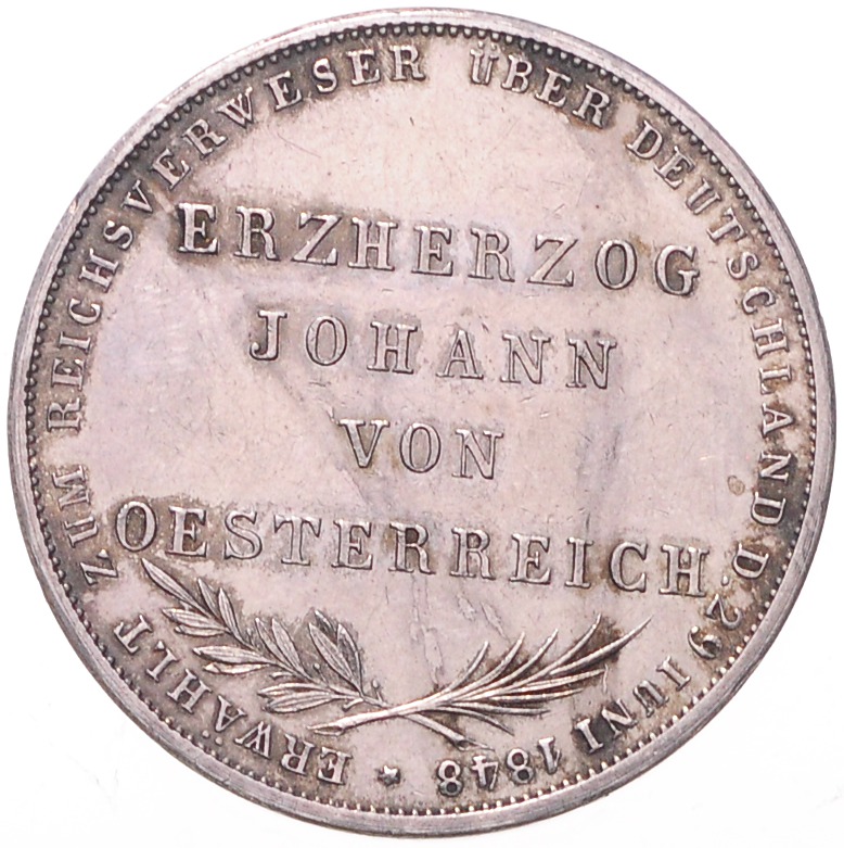 Doppelgulden 1848 Erzherzog Johann v. Österreich, erwählt zum Reichsverweser. Kahnt 176, Davenport 644, Slg. Montenuovo 39, AKS 135. ss