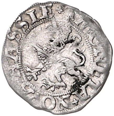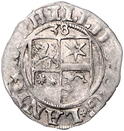 Philipp der Großmütige 1509-1567. 1/2 Albus 1538 Viergeteiltes hessisches Wappen mit Katzenelnbogen, Ziegenhain, Nidda und Diez, darüber 38 / Der hessische Löwe. Schütz 411, Hoffmeister 303. Belag 1,09 g. ss
