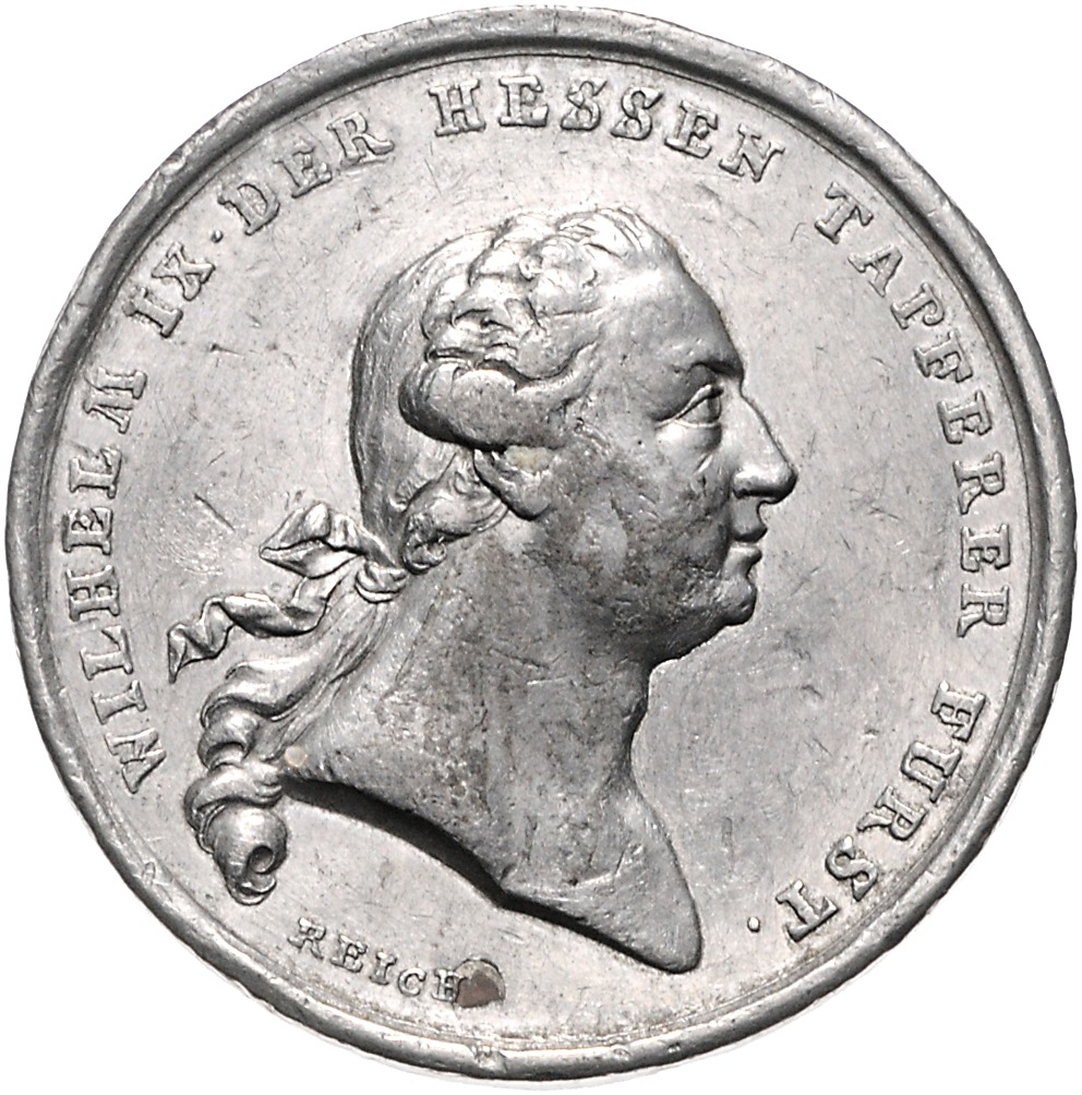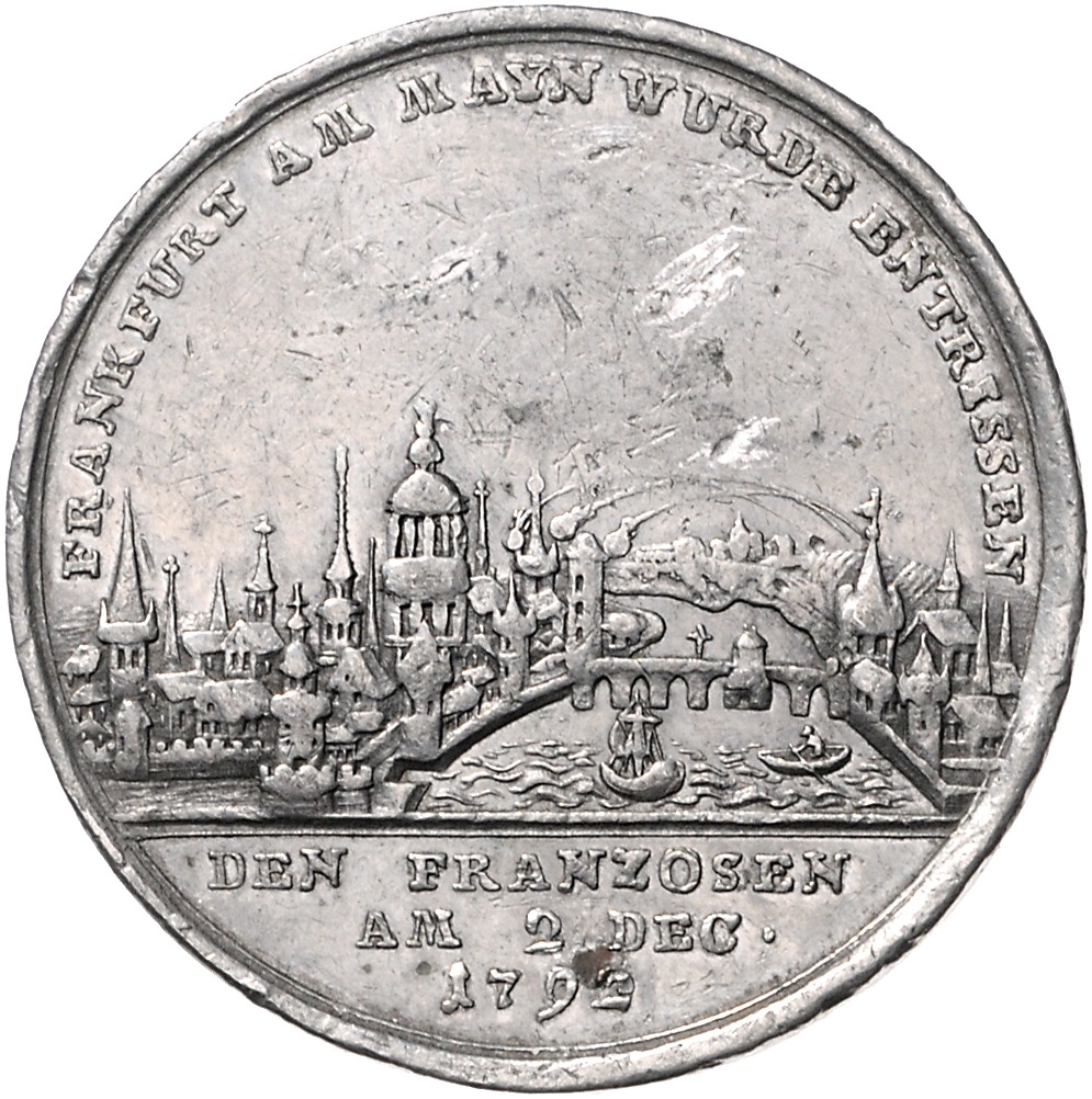 Wilhelm IX. 1785-1803. Zinnmedaille 1792 (v. Reich) auf die Befreiung Frankfurts von den Franzosen. Schütz 2125. kl. Rf., mit Kupferstift 42,8 mm, 30,42 g. ss