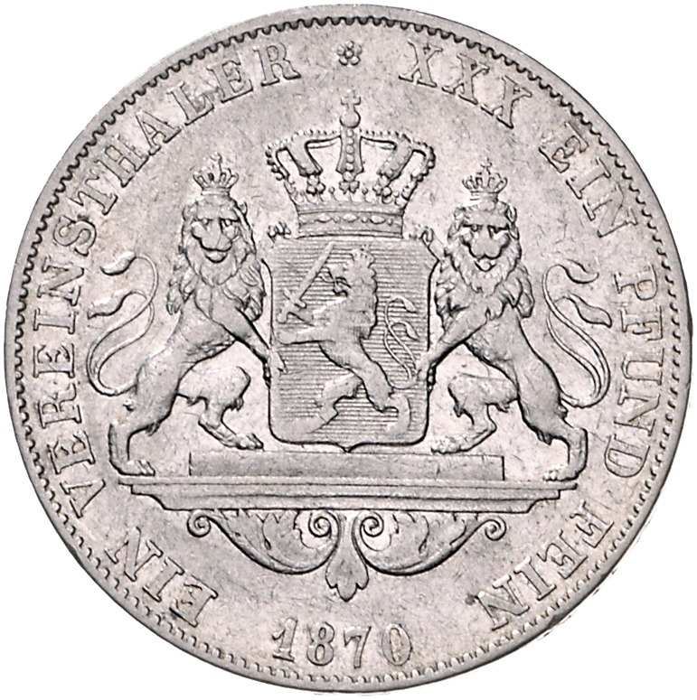 Ludwig III. 1848-1877. Vereinstaler 1870. Kahnt 266, Davenport 707, AKS 120, Thun 200. ss