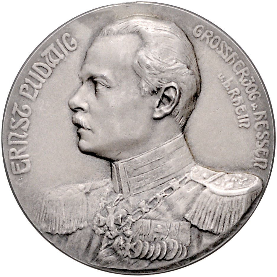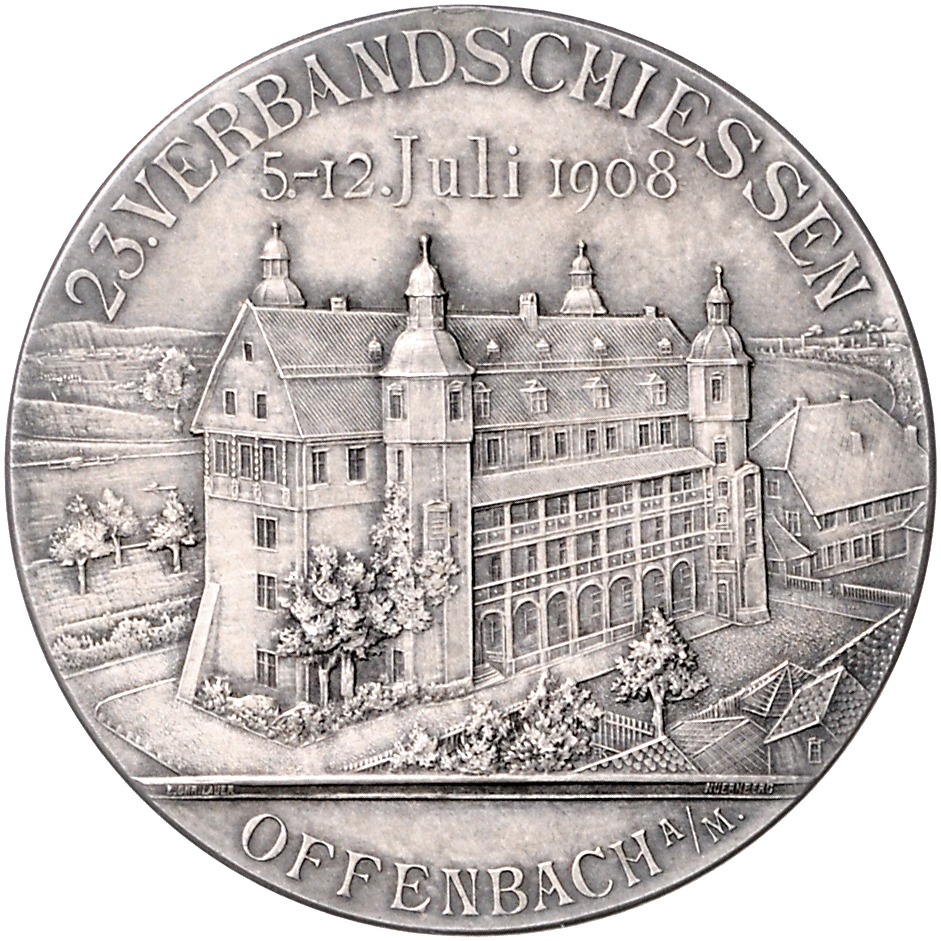 Ernst Ludwig 1892-1918. Silbermedaille 1908 (v. Lauer) auf das 23. Verbandsschießen in Offenbach a.M., i.Rd: SILBER 990. Peltzer 1563. mattiert, entfernte Öse 40,4 mm, 24,41 g. vz