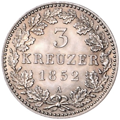 Friedrich Wilhelm IV. König von Preussen 1849-1861. 3 Kreuzer 1852 A. AKS 23, Jaeger 20, Olding 353. Prachtexemplar. st