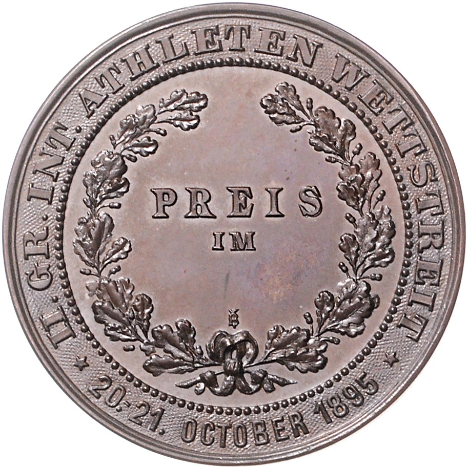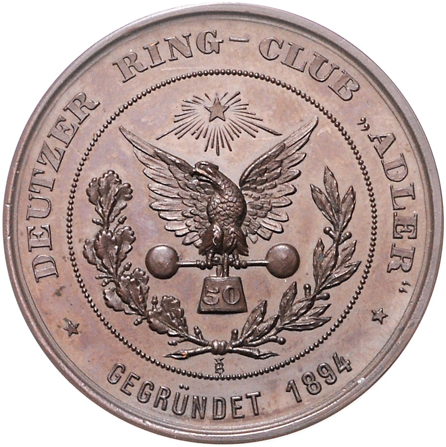 Bronzemedaille 1895 Prämie des Deutzer Ring-Clubs ADLER, gegr. 1894 anlässlich des II. großen Internationalen Athleten-Wettstreits am 20./21. Oktober. Prachtexemplar mit hübscher Patina 39,2 mm, 18,39 g. PP