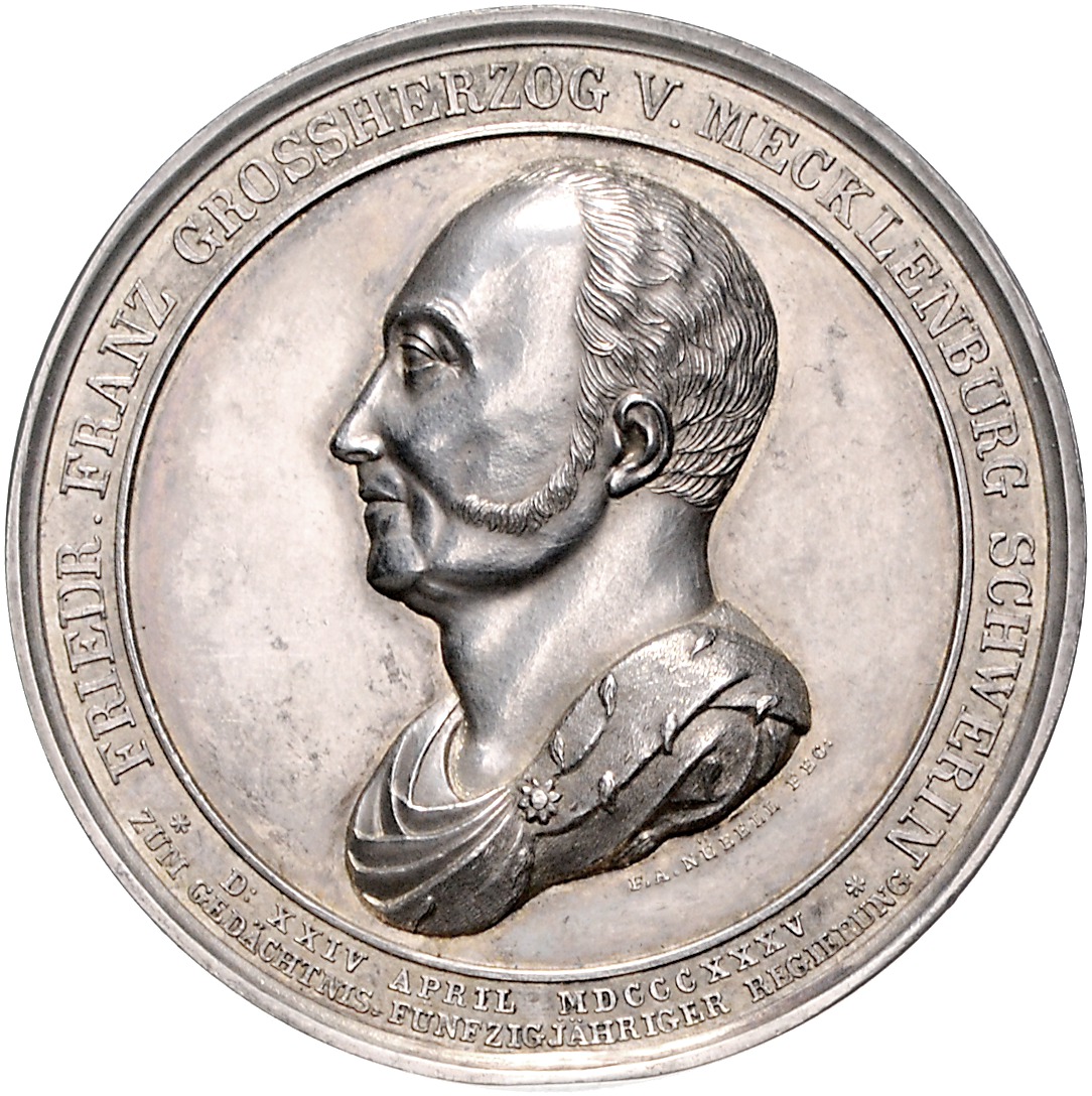 Friedrich Franz I. 1785-1837. Silbermedaille 1835 (v. Nübel) auf sein 50-jähriges Regierungsjubiläum. Kunzel 68, Gaettens 479. kl. Rf. 46,6 mm, 45,46 g. vz+